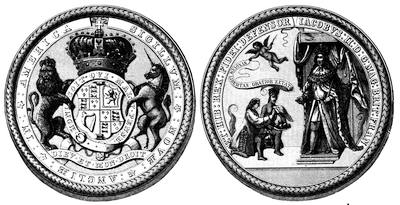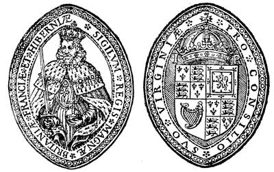 The first great seal of the Province was lost during Ingle’s Rebellion; and in 1648 the Proprietary sent out another seal, slightly different. This seal had engraven on one side the figure of the Proprietary in armor on horseback, with drawn sword and a helmet with a great plume of feathers, the trappings being adorned with the family arms. The inscription round about this side was: Cecilius absolutus dominus Terra Mariæ et Avaloniæ Baro de Baltimore. On the other side of the seal was engraven a scutcheon with the family arms; namely, six pieces impaled with a band dexter counterchanged, quartered with a cross bottony, and counterchanged; the whole scutcheon being supported with a fisherman on one side and a ploughman on the other (in the place of the family leopards), standing upon a scroll, whereon the Baltimore motto was inscribed; namely, Fatti maschii, parole femine. Above the scutcheon was a count-palatine’s cap, and over that a helmet, with the crest of the family arms; namely, a ducal crown with two half bannerets set upright. Behind the scutcheon and supporters was engraven a large ermine mantle, and the inscription about this side of the seal was, Scuto bonæ voluntatis tuæ coronasti nos. In 1657 Lord Baltimore sent out another seal, similar in design, which was used till 1705. Subsequent changes were made in the seal and arms of the Province and State, but in 1876 the last described side of the Great Seal sent out in 1648 was adopted as the arms of Maryland. A full account of the pedigree of the Calverts will be found in An Appeal to the citizens of Maryland, from the legitimate descendants of the Baltimore family, by Charles Browning, Baltimore, 1821. [Fuller’s Worthies of England and Anthony Wood’s Athenæ Oxoniensis give us important facts regarding the first Lord Baltimore. See John G. Morris’s The Lords Baltimore, 1874, No. 8 of the Fund Publications of the Historical Society; and Neill’s English Colonization in North America, ch. xi.—Ed.]