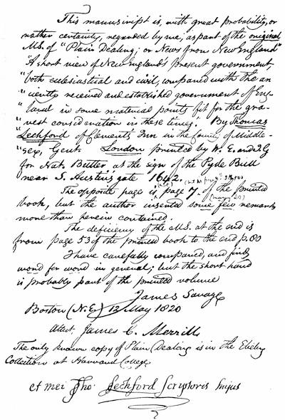 | Autographs[x]: William Blaxton, 311; Samuel Maverick, 311; Thomas Walford, 311; Mathew Cradock, 312; John Wilson, 313; Quaker autographs, 314; John Endicott, 317; Colonial ministers of 1690 (Charles Morton, James Allen, Michael Wigglesworth, Joshua Moody, Samuel Willard, Cotton Mather, Nehemiah Walter), 319; Joseph Dudley, 320; Abraham Shurt, 321; Thomas Danforth, 326; Thomas Hooker, 330; John Haynes, 331; John Winthrop, the younger, 331; John Allyn, 335; William Coddington, 336; Samuel Gorton, 336; Narragansett proprietors (Simon Bradstreet, Daniel Denison, Thomas Willett, Jno. Paine, Edward Hutchinson, Amos Richison, John Alcocke, George Denison, William Hudson), 338; Roger Williams, 339. | |