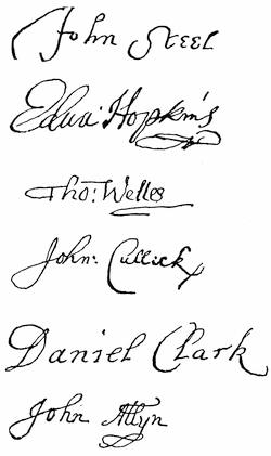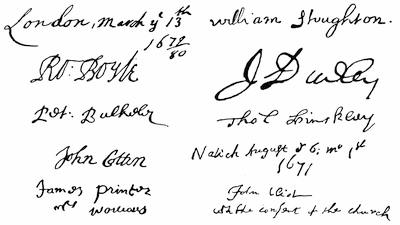 | Autographs: Leaders in Pequot war (John Mason, Israel Stoughton, Lion Gardiner), 348; Jonathan Brewster, 349; Nathaniel Ward, 350; Signatures connected with the Indian Bible (Robert Boyle, Peter Bulkley, William Stoughton, Joseph Dudley, Thomas Hinckley, John Cotton, John Eliot, James Printer), 356; Edward Johnson, 358; John Norton, 358; Edward Burrough, 359; Robert Pike, 359; Benjamin Church, 361; Thomas Church, 361; William Hubbard, 362; Walter Neale, 363; Ferdinando Gorges, 364; John Mason, 364; Roger Goode, 364; Thomas Gorges, 364; Connecticut secretaries (John Steel, Edward Hopkins, Thomas Welles, John Cullick, Daniel Clark, John Allyn), 374. | |