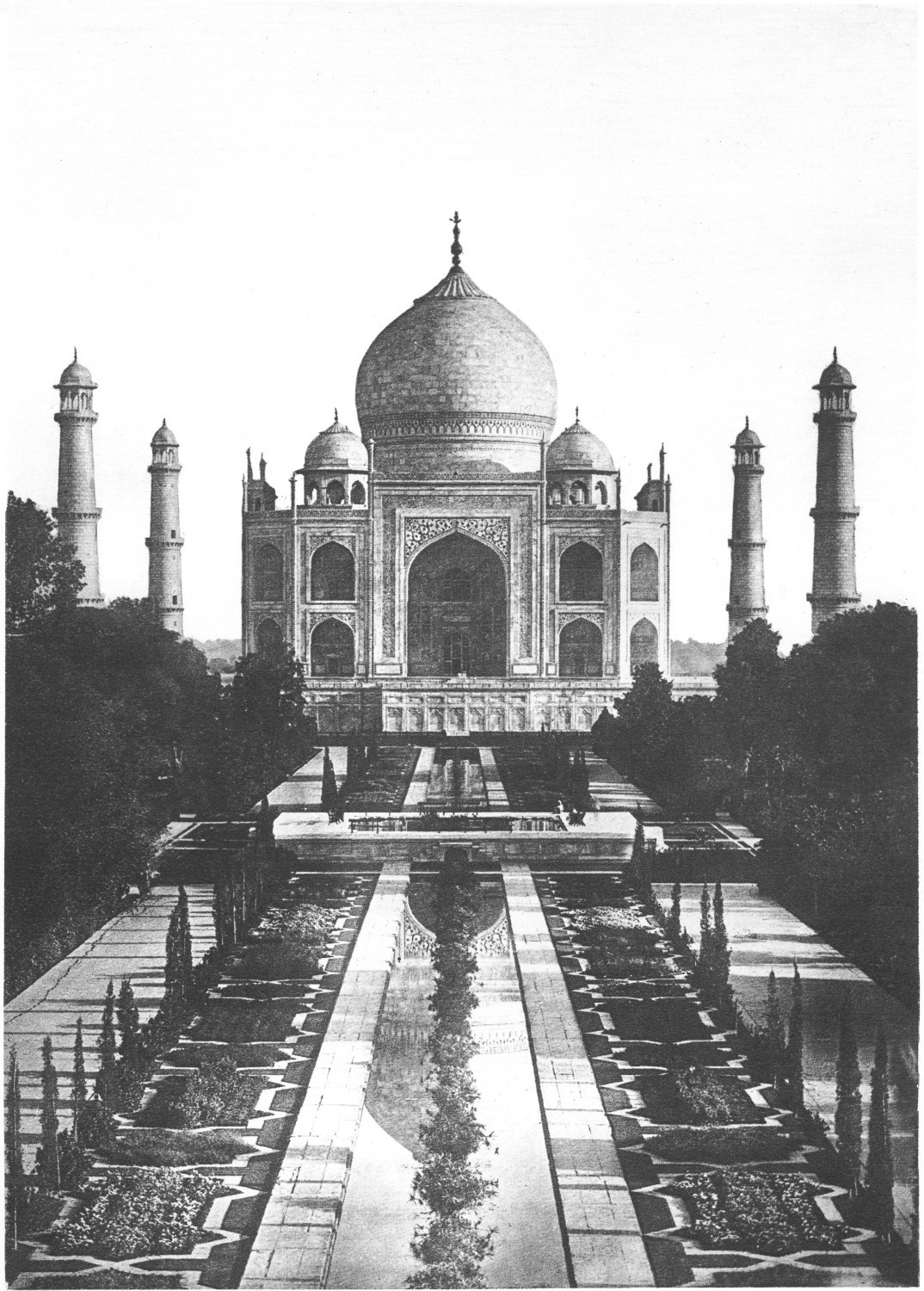 The approach through the splendid gardens seen in the foreground is bordered by dark cypress trees, which contrast admirably with the color of the marble domes beyond.
