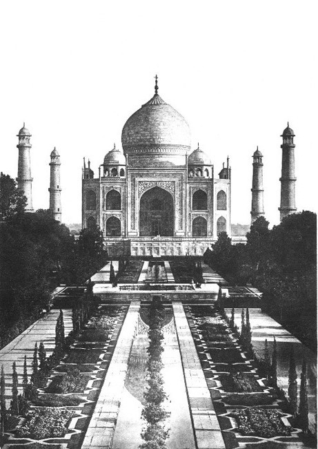Few if any buildings in the world have been the subject of such praise as that bestowed upon the Taj Mahal ("Gem of Buildings"). Travelers,[2] painters, authors, and poets have all sought to express in word or color the indefinable charm of this gem of Indian art. Built at Agra, in India, by the great mogul of Delhi, Shah Jahan, as a tomb for his favorite wife, Mumtaz Mahal, the Taj is a veritable translation into stone of human remembrance and affection. It was begun in 1632, and was completed in twenty-two years. The material of which it is built is pure white marble, and inlaid in its walls are jaspers, agates, and other stones in marvelous designs. But it is perhaps the dome that gives the greatest beauty to this tomb. Of typical Eastern shape, it rises a mass of white against the deep blue of the Indian sky, or shines like silver in the radiance of the Indian moon.