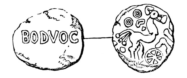 Coins bearing the word BODVOC, BODVO, or ODVOC, have usually, but erroneously, been ascribed to Boadicea, Queen of the Iceni. As is remarked by Evans, “there is no ground for supposing that any coins were struck by Boadicea, who never seems to have exercised the queenly power, unless as the leader of a short-lived revolt, and whose chief complaint against the Romans was, that the kingdom left by her husband Prasutagus, to which possibly she may have hoped to succeed, was overrun and pillaged by their troops, she herself scourged, and her daughters put to shame.” Moreover, no coins of BODVOC have ever been found in the Icenian territory, but are confined to the opposite side of the country; and are evidently of a date anterior to the revolt of Boadicea. The usual type has on the obverse simply the word BODVOC in large letters across the field; reverse, a horse of more or less disjointed character, with chariot-wheel and other details. One example has, however, on the obverse a profile bust to the left, and letters BODVO in front of the face; and reverse, a horse, etc.