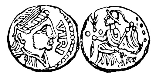 A son of Commivs. Obverse, an expanded five-lobed leaf, or a cluster of five oak leaves, with VI on one side, and RI on the other; a sunk tablet of various forms, with the letters COM·F; VERI·COM·F in two lines; VERICA COMMI F encircling a circular shield, or other object; COM F between crescents with horns facing inwards; a semi-draped seated figure, with VERICA; a filleted bust with VIRRI; and others, examples of which are here engraved. Reverse, on some a horseman galloping or leaping, with CO·F, VIR REX, or VIR; a riderless horse with REX, VI, VIR; a lion with VIR; a trophy of an attempted imitation of the Roman caduceus between two cornucopiæ, rising from a two-handled vase, and COMMI F; a capricorn, with EPPI COM F, etc.; this latter being very remarkable as bearing the names of the two brothers Verica and Eppillus. Another variety has a horseman on each side, with COM F on the obverse, and VERICA on the reverse; and another, a diademed and draped bust on one side with VIRI, and on the other, a seated figure of Victory (?), as here engraved.