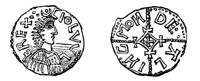 Only two coins, according to Mr. Evans, are known bearing this name, or rather commencement of a name, the remainder of which is unknown. One of the two known examples bears on the obverse a cross whose limbs are formed of three rows of beads, with central ring, and in the angles between the limbs of the cross the letters C R A B. Reverse, an eagle rising regardant. The other has, obverse, the letters C R A B on a tablet, above which is an annulet, and, below, an S-shaped object; reverse, a tressure of six beaded points, points outwards, with a central ring, and within each of the outer curves three pellets.