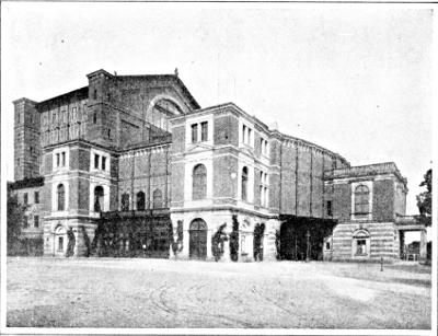 It was in 1870 that Wagner’s dream of a theater of his own gave promise of full realization. In 1864 King Ludwig of Bavaria, at the age of nineteen, gave Wagner his patronage, and backed him financially. By this means, in the years 1865-1870 Tristan, Meistersinger, Rheingold, and Walküre were performed in Munich. The King wanted the festival house there, but the court and the populace regarded this plan with jealous resentment. Moreover, Wagner preferred a more remote place better suited to fostering a new art undertaking. So the little town of Bayreuth was chosen. Wagner obtained from the municipality a free grant of land for a festival-theater and his own house. The architect Gottfried Semper was commissioned to prepare definite plans. Everything was settled but the money, and the estimated cost was 1,125,000 francs. Wagnerian societies were formed all over Europe, and in the United States, and the interest of financial men in Germany was secured. The foundation stone of the Festival-Theater was laid with great ceremony by Wagner himself on May 22, 1872, the 59th anniversary of his birth. The work of construction proceeded rapidly, although the subscriptions were short of the total sum required. Ludwig made up the amount lacking.