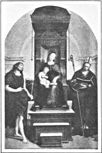 The Florentine trio—Michelangelo, Raphael and Leonardo—are represented here in rather dubious examples. The two Michelangelos are school pieces, though very good work, and the genuineness of the Leonardo da Vinci (vín-chee) “Madonna of the Rocks” is disputed by a similar picture in the Louvre. The London picture has much beauty about it, and no doubt Leonardo had some hand in its production, but he was probably assisted in it by a pupil. As for Raphael, there are several pictures assigned to him, but none of them gives much of an idea of that great artist. The “Ansidei Madonna” cost a great deal of money, and has renown; but it is a thin, cold work of Raphael’s youth. If you would see Raphael and judge him justly, you must go to Florence and Rome. Florence, too, is the proper place to see painters such as Andrea del Sarto, while Perugia is the spot for Perugino, and Parma for Correggio (kor-red´-jo). One’s opinion of an Italian painter is not to be formed from seeing one or more isolated examples of him in the northern galleries.