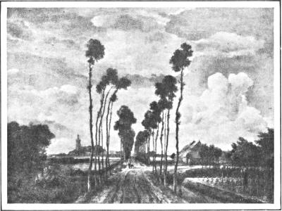 In Dutch art the name of Rembrandt usually leads all the rest, and here in the London gallery are many examples put down to him. The early “Portrait of an Old Lady,” herewith reproduced, is perhaps the most satisfactory of all, not only because of its wonderful rendering of an aged face, but because of the great humanity shown in it. The tremulous line of the lips and chin, the flabby cheeks of old age, the eyes that seem filled with tears, all suggest a life that has known sorrow. That appealed to Rembrandt very strongly. He was always sympathetic with the suffering because, perhaps, he had suffered himself. No painter could put more feeling or meaning into a face, a hand, an arm, a bent form than he. He was the great genius of Netherland art. Hals was a mere tavern-roysterer with a gift for painting, compared with him. The National Gallery, however, has no first-rate example of Hals, though several mediocre canvases are attributed to him. Nor is Steen, or Vermeer of Delft, or De Hooch seen here at his best. By Terborch there is a “Guitar Lesson” showing a young woman in white and yellow satin that is attractive, and a beautifully drawn “Portrait of a Gentleman.” Cuyp (kipe) is shown, in many examples, and better than in any other European gallery. This is also true of the sea-painter Jan van de Cappelle. There is a whole wall devoted to examples by Ruisdael, (rise´-dale) and among the many Hobbemas is one at least of commanding interest—“The Avenue, Middelharnis.” It is slate-grey in color, but its linear perspective and atmosphere have made it very popular.