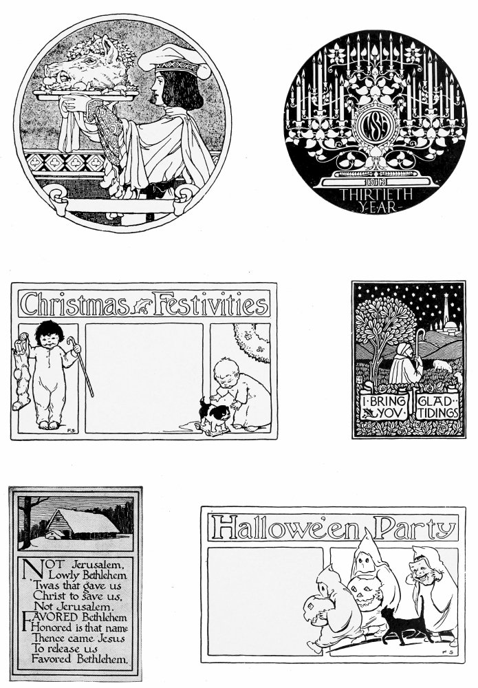 A Page of useful holiday designs. These may be used as the basis of original cards. Their wide range suggests a variation of techniques. Simple line drawings, similar to that of Hallowe’en are best adapted to hand coloring.