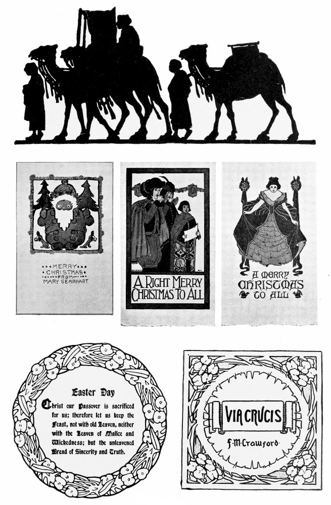 In late years we find many artists and designers, who cannot find suitable cards in the book shops, sketching designs of their own and having them printed. In this way they can put in an individual touch and produce a card that exactly meets their requirements. Although such a card is more expensive than a stock card, the plan works out well for those who have a fair list of mailing acquaintances. A page of such cards is shown in Plate 6.