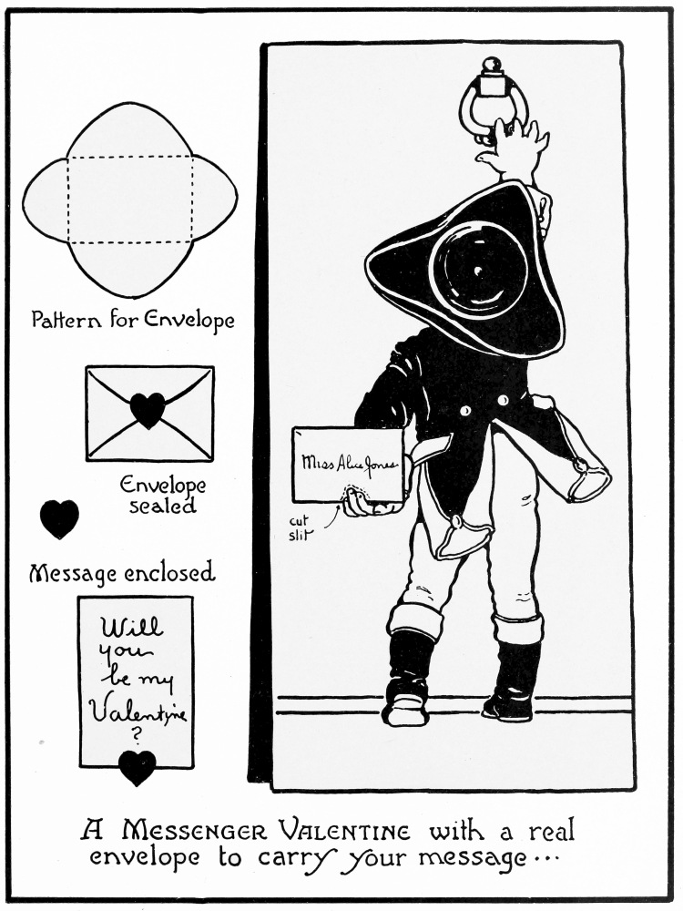 A Valentine containing unique possibilities is shown in Plate 16. The same idea can be varied so as to make a number of novel cards. The little envelope, which this card features, is easily constructed and will hold quite a message, if written carefully. The figure of the messenger can be hand colored in buff and vermilion.