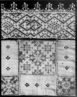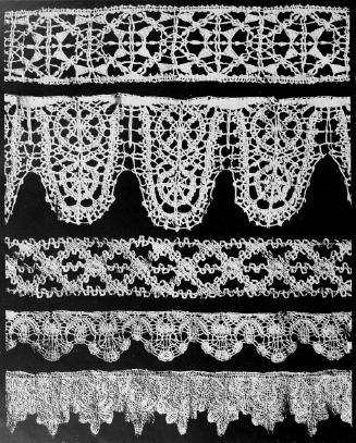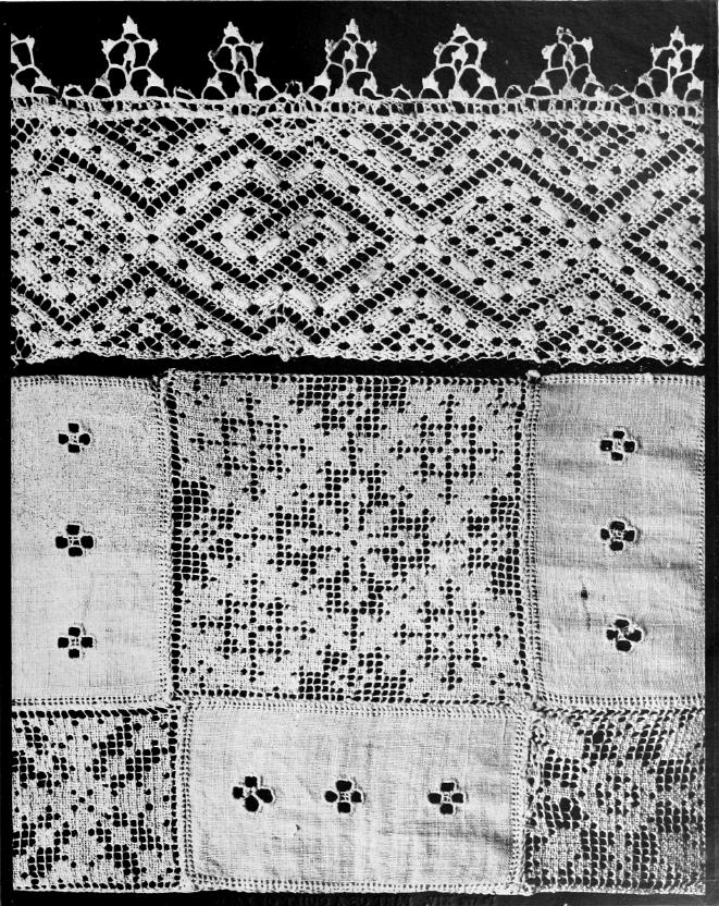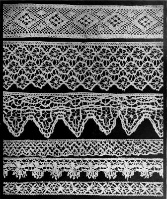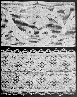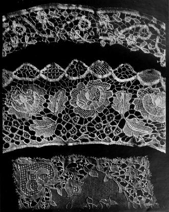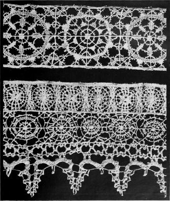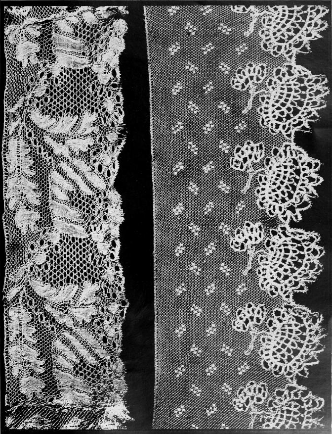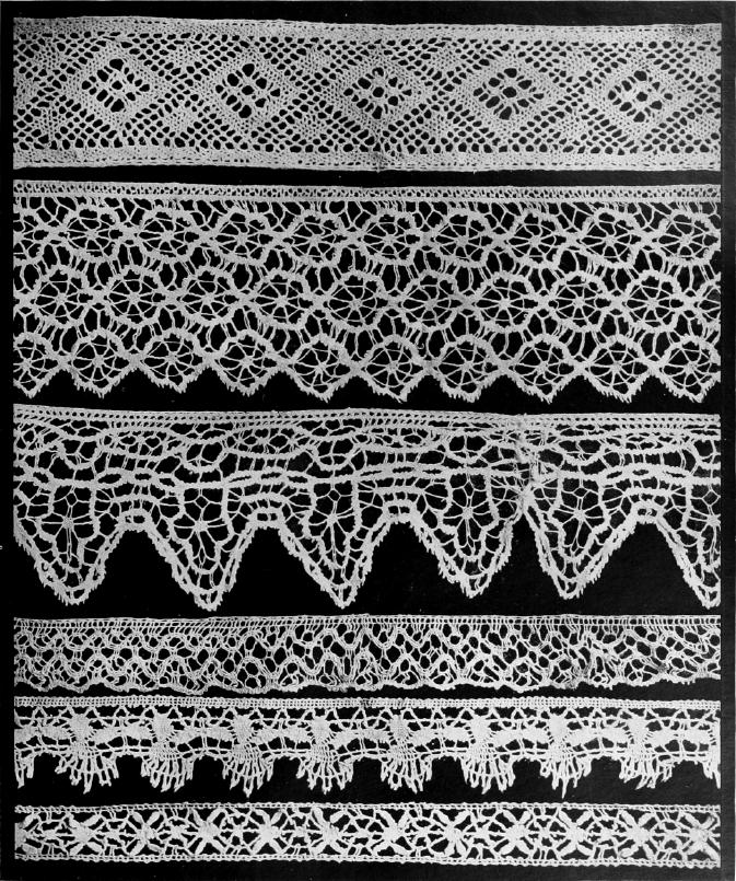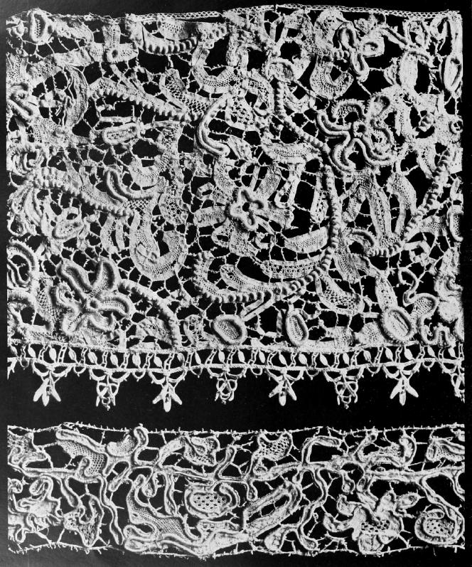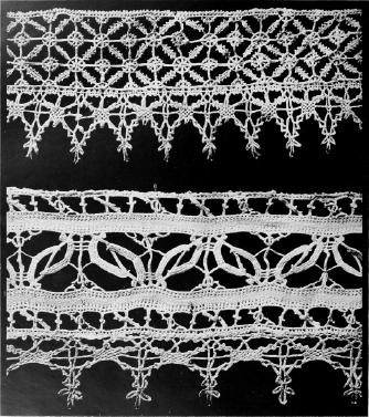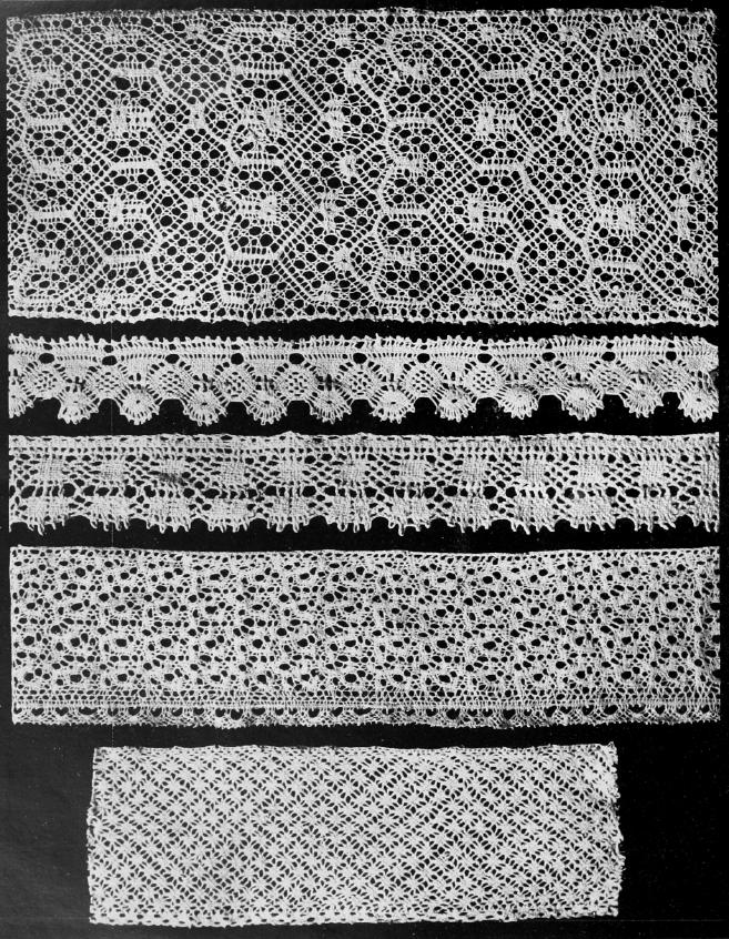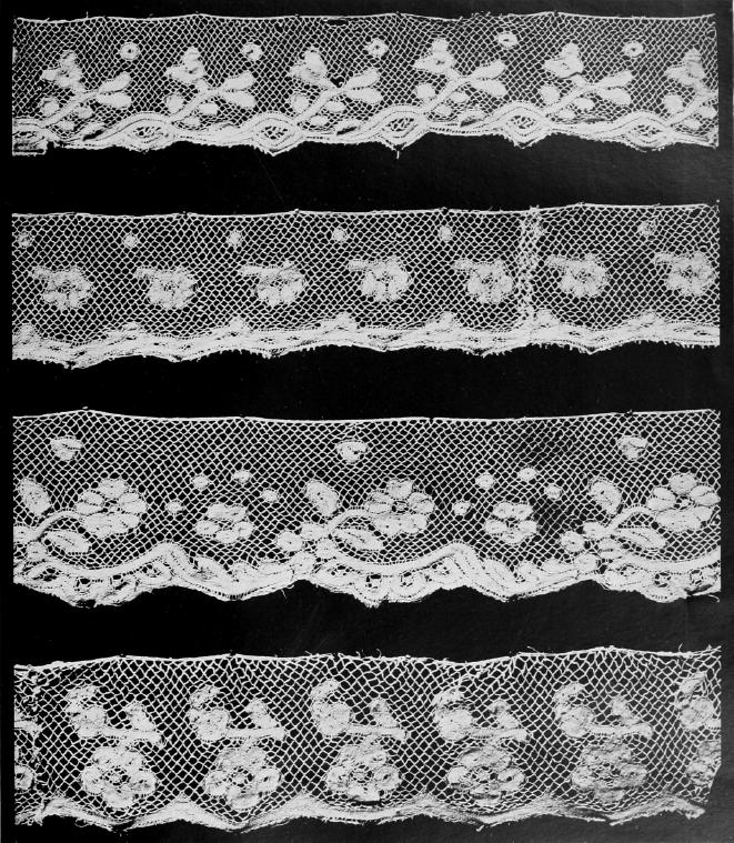 No. 1 is of linen thread with a heavy thread introduced, not as in some Flemish laces to outline the pattern, but to form strong leading lines in it.