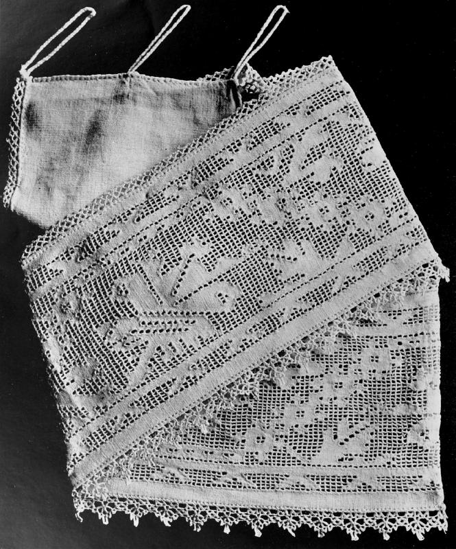 I have been tempted to touch upon this matter of lace points, vandykes, and scallops because the border of the alb, said to have been worn by Pope Boniface VIII., consists of scallops of bobbin-made thread-work, and of a type of pattern and texture which I should say cannot very well be earlier in date than the middle of the sixteenth century. On the other hand, the ornamental thread-work done in "punto di treccia" and "punto a stuora," which fills large and small squares and remarkable five-sided figures, seems to have some Saracenic or Moorish character, and may possibly not be assignable to the sixteenth century with the same cogency of inference as applies to the scallops of Italian "merletti a piombini" on the border of the alb.