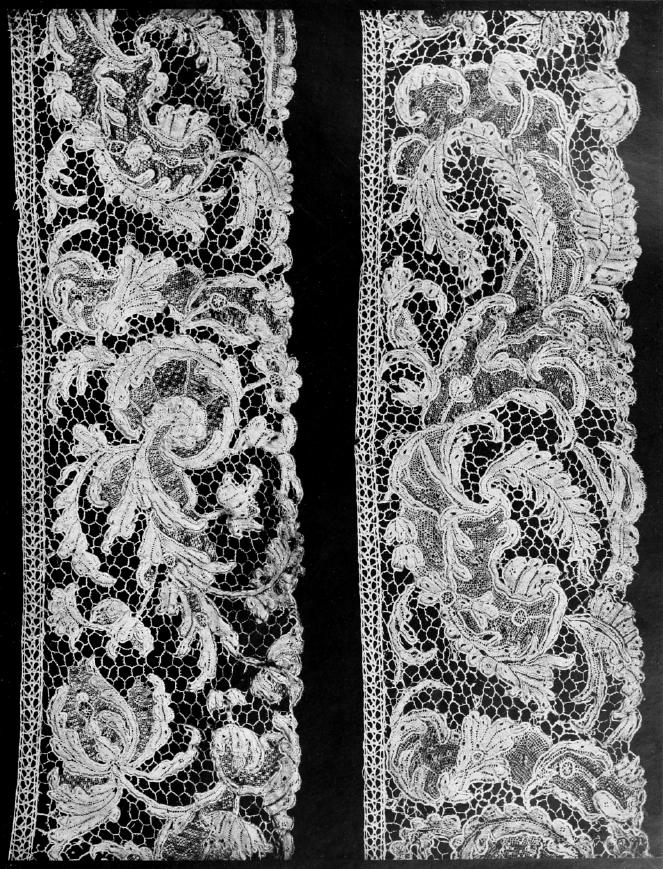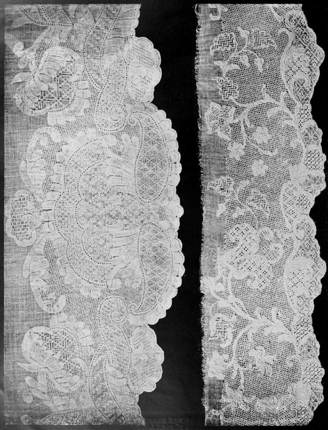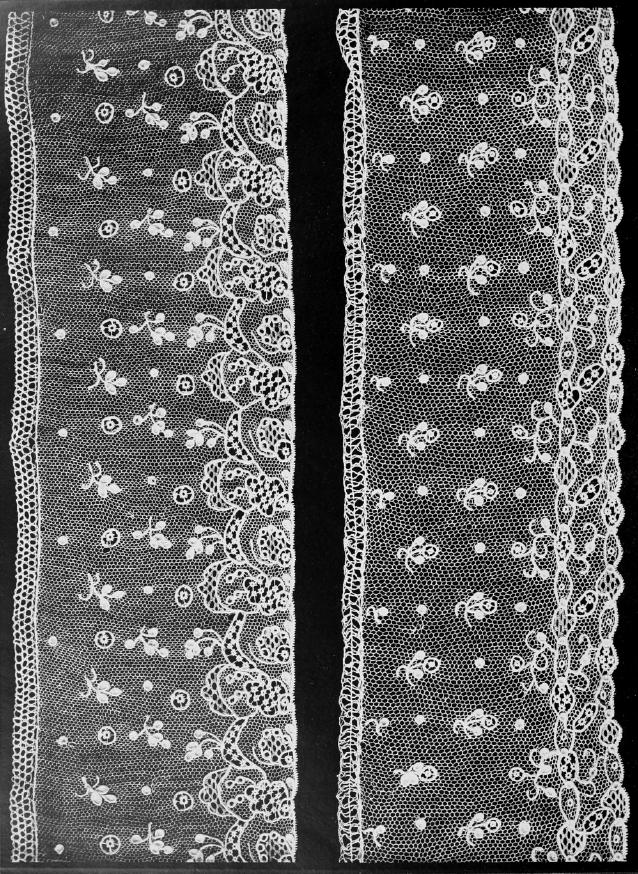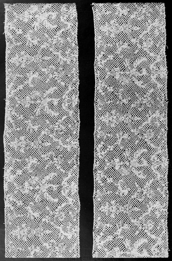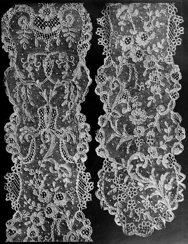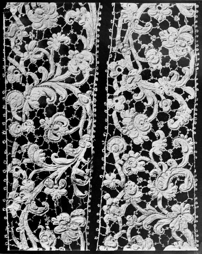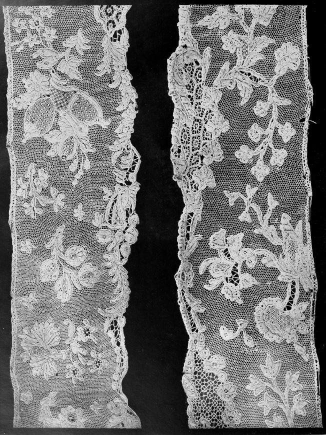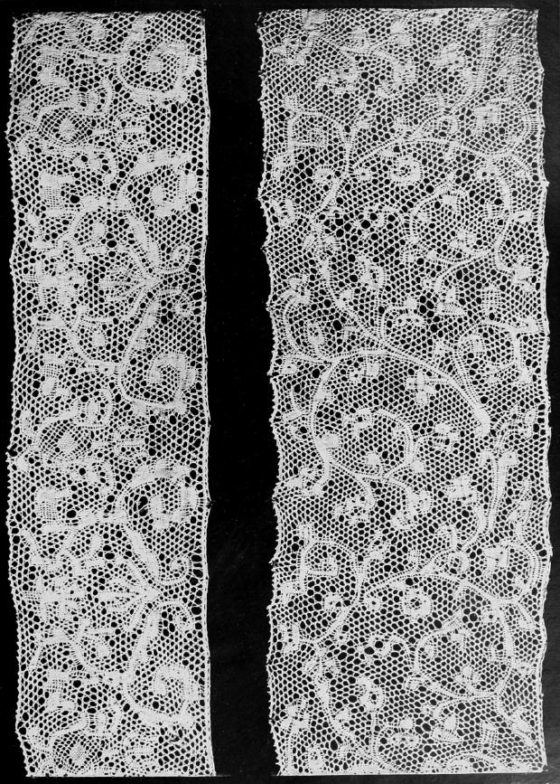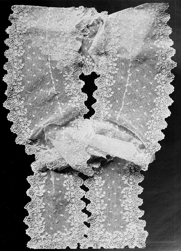 No. 1. A scarf of bobbin-made lace, called Antwerp lace, or Potten Kant or Pot Lace. The réseau is somewhat similar to that of the point de Paris, a variant of the cinq trous. The lace is made on the pillow in strips which are almost imperceptibly joined together. The toilé details are outlined with a stout thread cordonnet