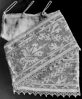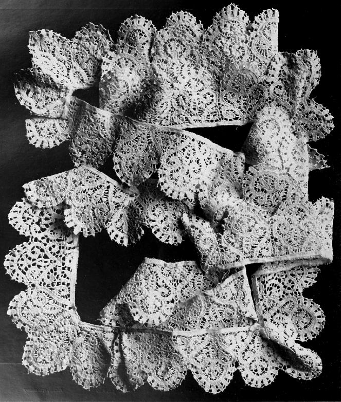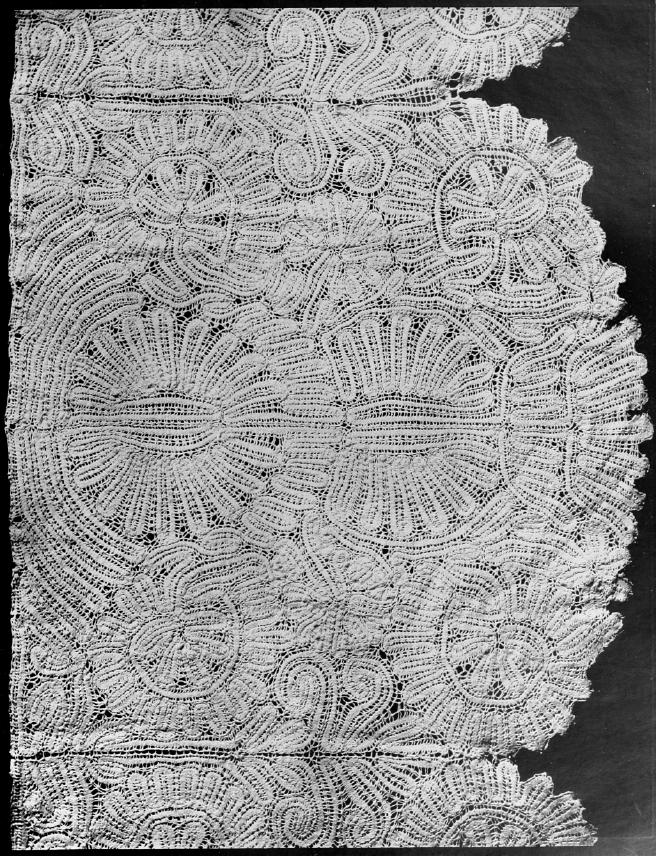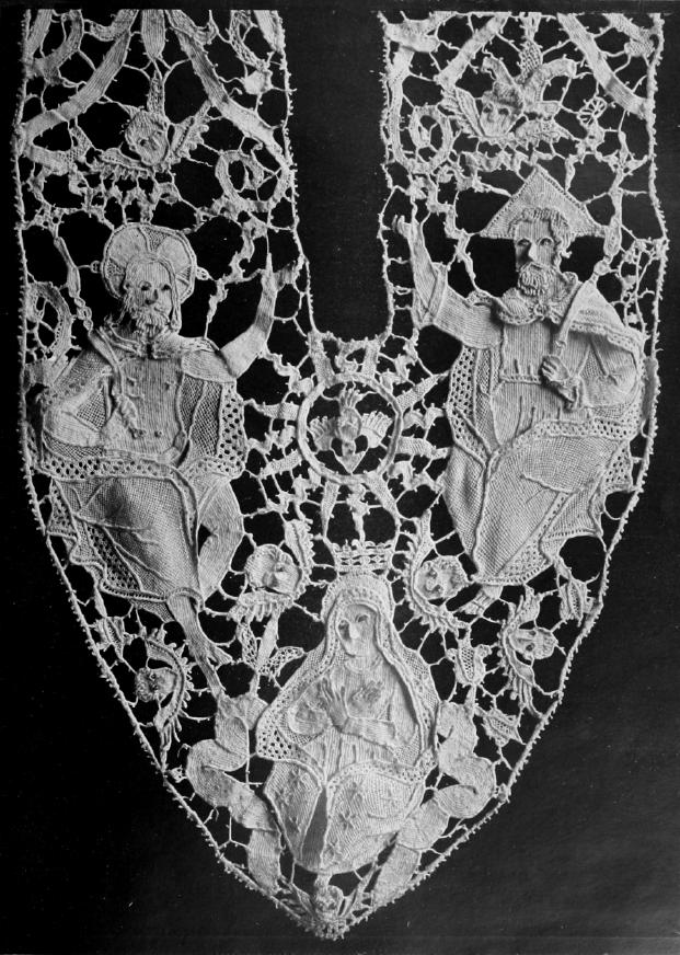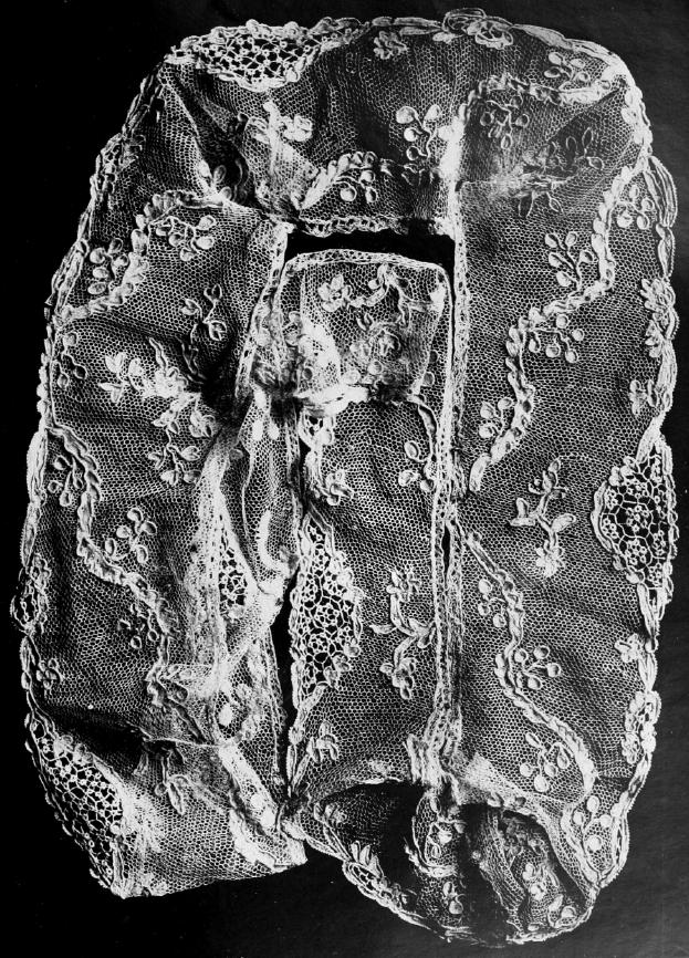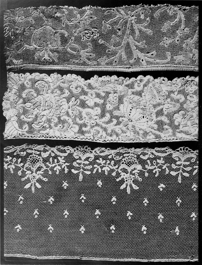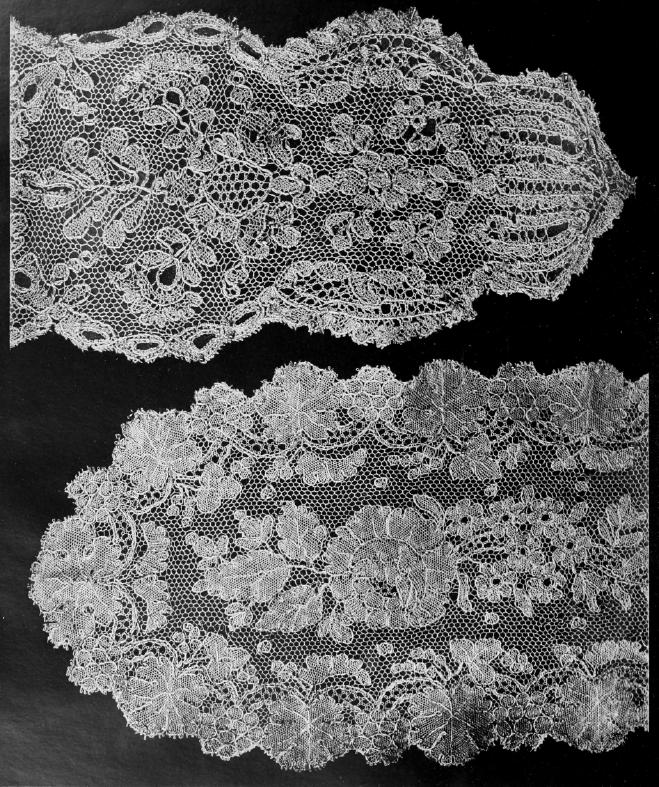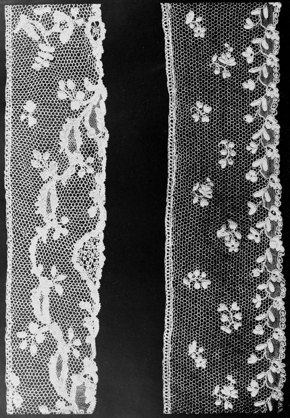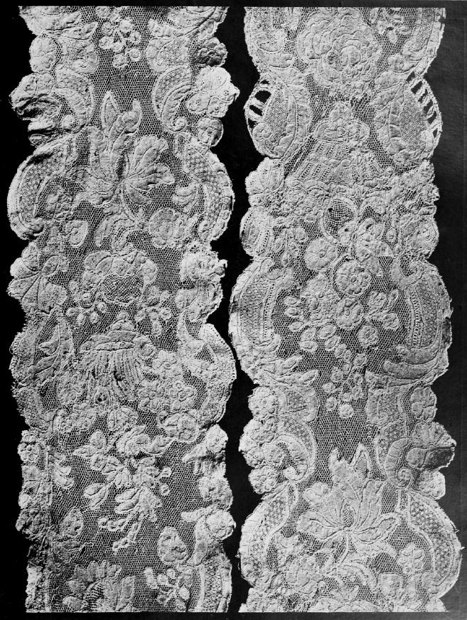 No. 1. A scarf of bobbin-made lace, called Antwerp lace, or Potten Kant or Pot Lace. The réseau is somewhat similar to that of the point de Paris, a variant of the cinq trous. The lace is made on the pillow in strips which are almost imperceptibly joined together. The toilé details are outlined with a stout thread cordonnet