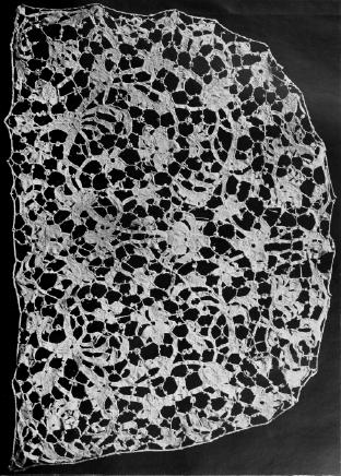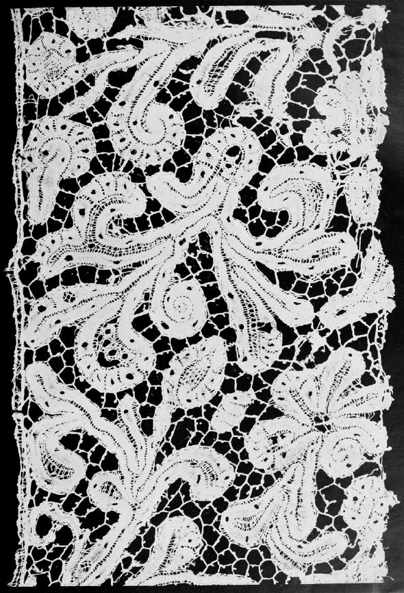 No. 1. Bobbin-made lace. The pattern of leaves is outlined in parts by a stout thread