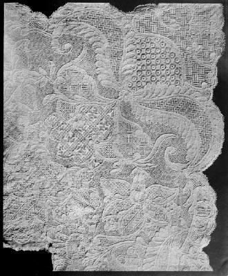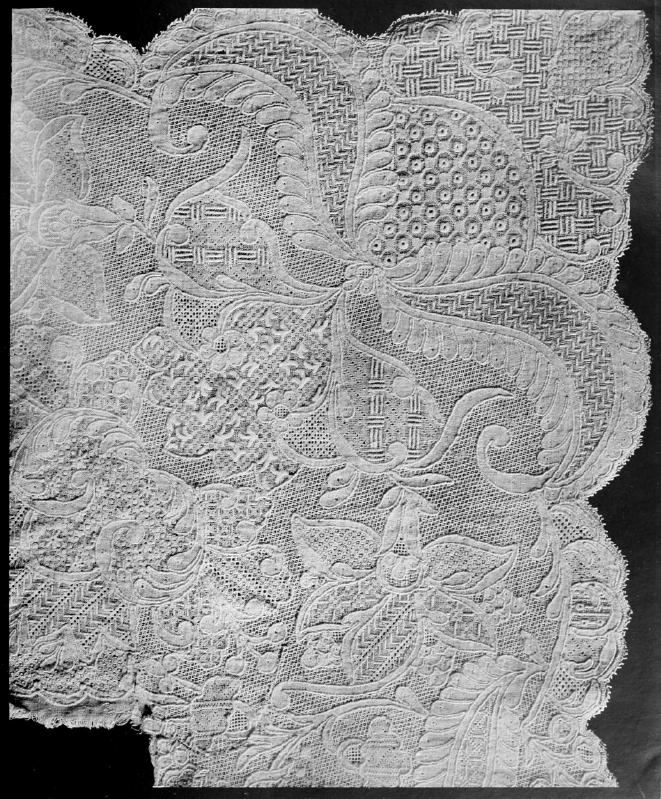 The ornamental details were made separately and then joined by bobbin-made brides: the modes or fillings are in the style of the cinq trous réseau.