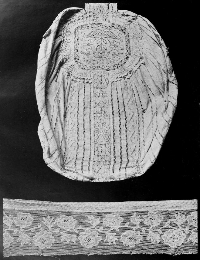 No. 2. A cap of bobbin-made lace, called Lille lace. The lace is made on the pillow in strips, joined together. The réseau is of simply twisted threads.