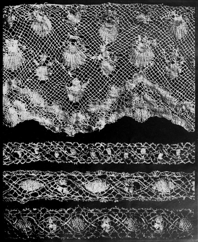 Plate CXII. THREE BORDERS OF BOBBIN-MADE LACE WITH A RÉSEAU OF MAGLIA DI SPAGNA