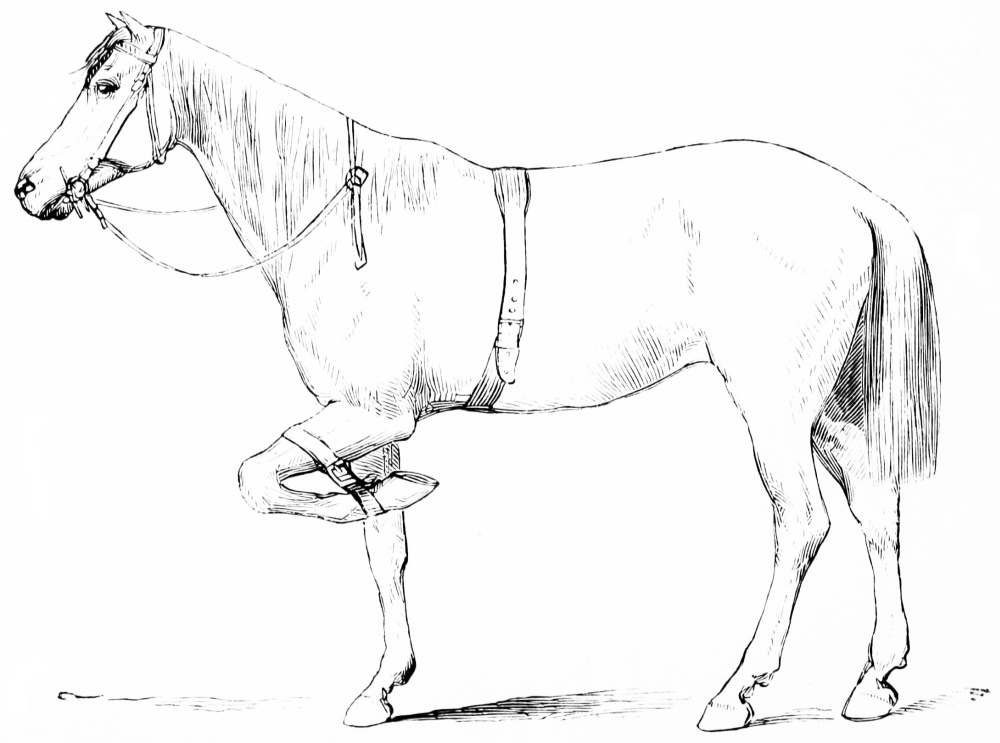 Take up one fore foot and bend his knee till his hoof is bottom upwards, and nearly touching his body; then slip a loop over his knee, and up until it comes above the pastern joint, to keep it up, being careful to draw the loop together between the hoof and pastern joint with a second strap of some kind to prevent the loop from slipping down and coming off. This will leave the horse standing{147} on three legs; you can now handle him as you wish, for it is utterly impossible for him to kick in this position. There is something in this operation of taking up one foot that conquers a horse quicker and better than anything else you can do to him. There is no process in the world equal to it to break a kicking horse, for several reasons. First, there is a principle of this kind in the nature of the horse: that by conquering one member you conquer to a great extent the whole horse.