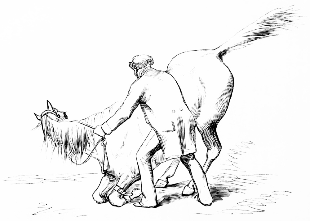Everything that we want to teach the horse must be commenced in some way to give him an idea of what you want him to do, and then be repeated till he learns it perfectly. To make a horse lie down, bend his left fore leg and slip a loop over it, so that he cannot get it down. Then put a surcingle around his body, and fasten one end of a long strap around the other fore leg, just above the hoof. Place the other end under the surcingle, so as to keep the strap in the right direction; take a short hold of it with your right hand; stand on the left side of the horse, grasp the bit in your left hand, pull steadily on the strap with your right; bear against his shoulder till you cause him to move. As soon as he lifts his weight, your pulling will raise the other foot, and he will have to come{159} on his knees. Keep the strap tight in your hand, so that he cannot straighten his leg if he rises up. Hold him in this position, and turn his head towards you; bear against his side with your shoulder, not hard, but with a steady, equal pressure, and in about ten minutes he will lie down. As soon as he lies down, he will be completely conquered, and you can handle him as you please. Take off the straps, and straighten out his legs; rub him lightly about the face and neck with your hand the way the hair lies; handle all his legs, and after he has lain ten or twenty minutes, let him get up again. After resting him a short time make him lie down as before. Repeat the operation three or four times, which will be sufficient for one lesson. Give him two lessons a day, and when you have given him four lessons, he will lie down by taking hold of one foot. As soon as he is well broken to lie down in this way, tap him on the opposite leg with a stick when you take hold of his foot, and in a few days he will lie down from the mere motion of the stick.