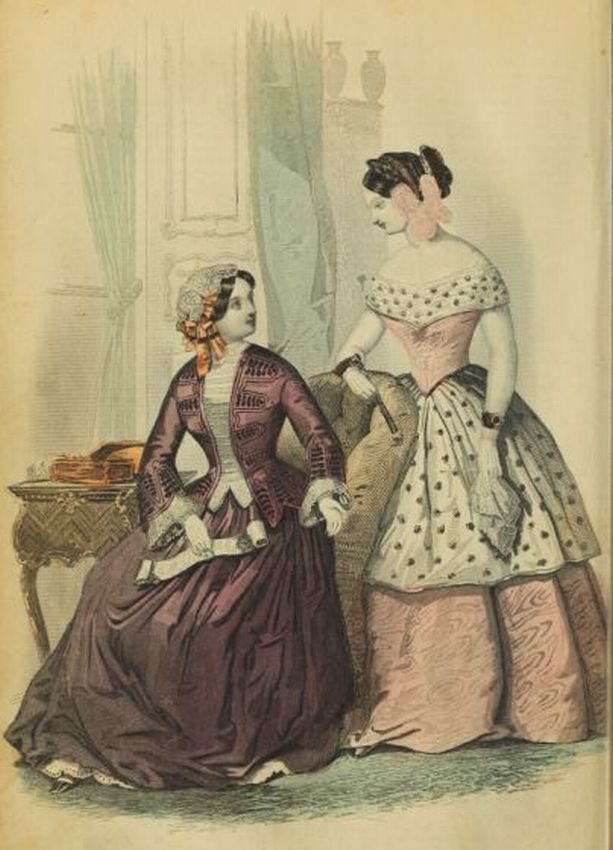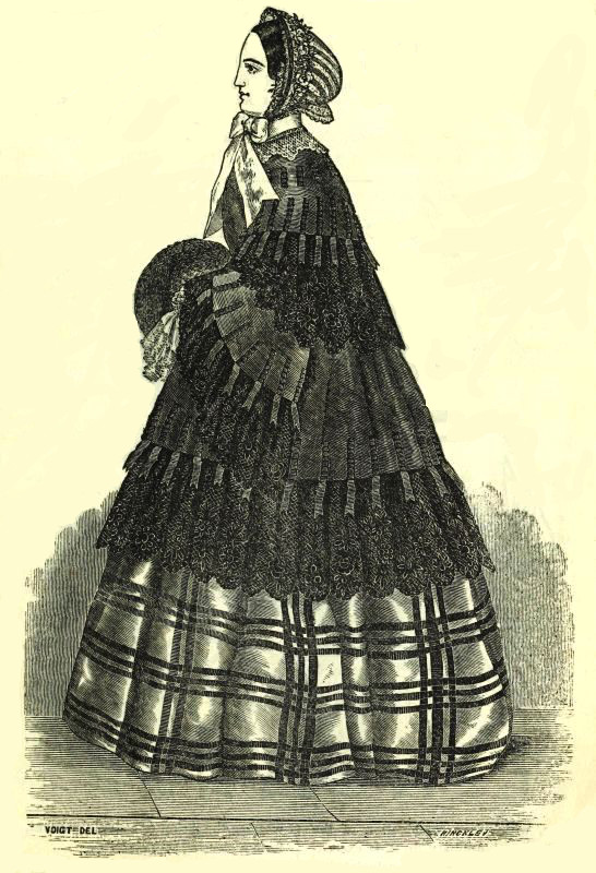 "Very little trimming suffices for mourning; indeed, the very intention of the dress would be lost if much were used. We know this is often the case; but it is sanctioned neither by taste nor economy. We have even seen ruffled bombazines. We object to them decidedly. Folds, by general consent, seem to be the most appropriate style; in the first place, from the thickness of the material generally in use, and again, from the plainness of the effect which is generally required. Broad flat galloons have also been the style the present year; but that is only a transient shade of fashion.
