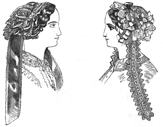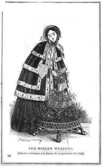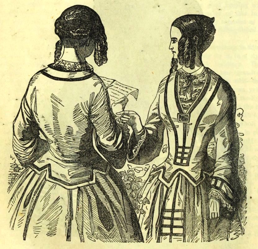 "Again, half mourning admits of as great a variety in shade and material as colors; lead and stone colors being considered appropriate; lavender, and even deep purple, are often used. What is thus denominated 'dressy black,' or, by the witty author of 'How to get Married,' 'mitigated grief,' seems to us to lose the sacredness with which sorrow usually invests the dress of a mourner.