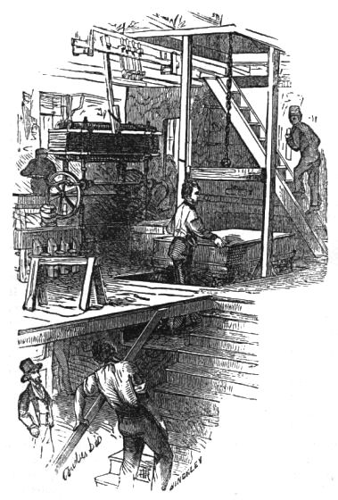 The following plate exhibits a piano-forte on the elevator passing from the fly-finisher's department to the ware-rooms. Of these steam elevators there are two, one at each end of the building; one for passing workmen, as well as lumber, to and from the machine-shop and drying-rooms, and one for passing cases and pianos up and down to the different rooms. Much ingenuity is shown in their construction, being so adjusted as to be sent up or down by a person on either floor, or by one on the platform, who, going or stopping at will, thus saves an immense amount of hard labor.