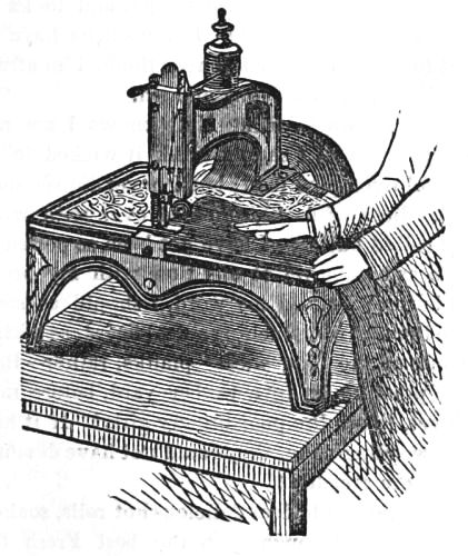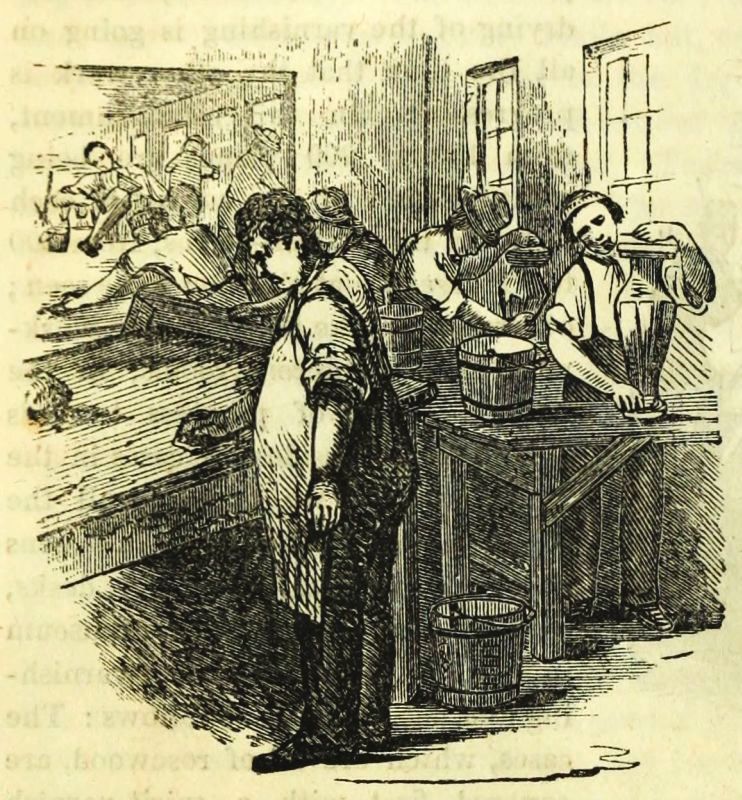 Having thus given a passing glance at most of the mechanical parts of the piano-forte, we will now examine the varnishing and polishing departments, consisting of some five or more large rooms. As the different layers of varnish require time to dry, it is policy to let the varnish harden while the workmen are busy putting in the various internal parts of the piano. Thus the case, when it comes from the case-maker, goes first to the first varnishing-room, and receives several coats of varnish; and, when the workman is ready to put in the sounding-board and iron frame, it is taken from the varnish-room to his department; and, when he has finished his work, it is again returned to the varnishing department, where it remains until the finisher wants it, who, when done with it, returns it to the varnishing-room. Thus, these varnishing-rooms are the store-rooms for not only the cases, but all the parts that are varnished; and the drying of the varnishing is going on all the time that the other work is progressing. In this establishment, from 150 to 200 pianos are being manufactured in the course of each day. In the varnish-rooms, from 100 to 150 cases are at all times to be seen; others are in the hands of the workmen in the different rooms, in the various stages of progress towards completion. Besides the cases in the varnish-rooms, we may see all the different parts of the pianos in dozens and hundreds, legs, lyres, tops, desks, bars, &c. &c., forming quite a museum in its way. The processes of varnishing and polishing are as follows: The cases, which are all of rosewood, are covered first with a spirit-varnish made with shellac gum, which, drying almost instantly, becomes hard, and keeps the gum or pitch of the rosewood from acting on the regular oil varnish. After the case has been "shellacked," it then receives its first "coat of varnish" and left to dry; and then a second coat is applied, and again it is left to dry. The varnish used is made of the hardest kind of copal gum, and prepared for this express purpose. It is called scraping varnish; it dries hard and brittle, and is intended to fill in the grain of the wood. When it becomes thoroughly dry and hard, these two coats are scraped off with a steel scraper. The case then receives several coats of another kind of varnish; when this is dried, it is ready for rubbing, which is effected by means of an article made of cloth fastened on blocks of wood or cork; and the varnish is rubbed on with ground pumice stone and water (a process somewhat similar to that of polishing marble). A large machine, driven by the engine, is used for rubbing the tops of pianos and other large surfaces. When the whole surface is perfectly smooth and even, it receives an additional coat of varnish. Each coat having become dry, hard, and firm, the surface receives another rubbing until it is perfectly smooth, when it receives a last flowing coat. After it is[104] thoroughly dried and hardened, it is ready for the polishing process, which consists in first rubbing the surface with fine rotten stone, and then polishing with the fingers and hands until the whole surface is like a mirror wherein we can
