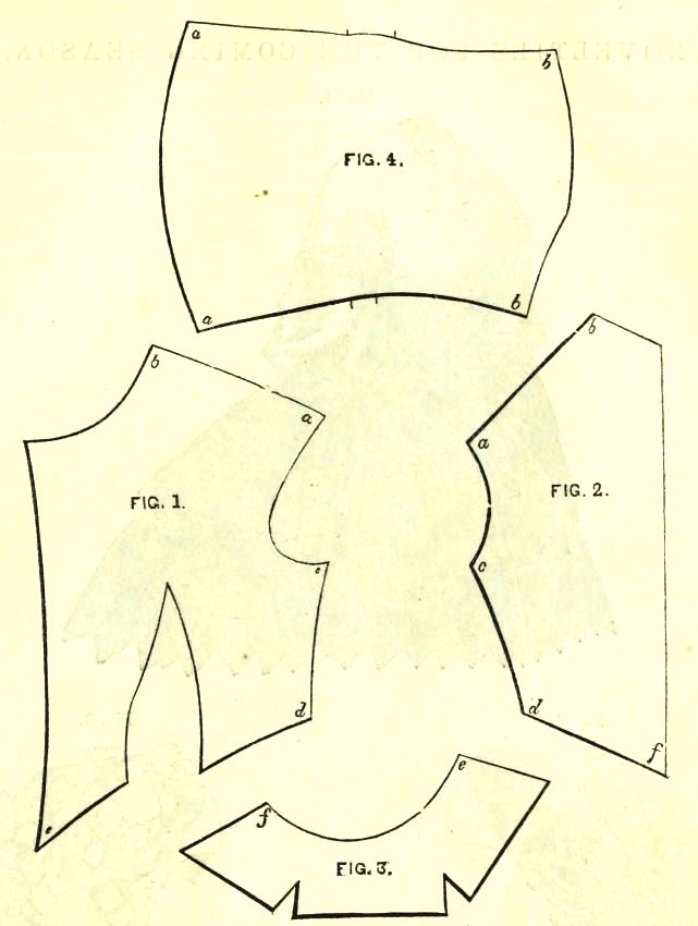 "In making up mourning, if in a thick material, a lead-colored lining will be sufficiently dark; in a thin material, it is usual to have the lining covered with thin Florence silk. Black linen will, however, answer the purpose. It should be boiled first in salt and water, and pressed out while damp. Black cambric, etc., will color the skin, and the stain be found very difficult to efface. The same is true of plain black lawns as a dress material.