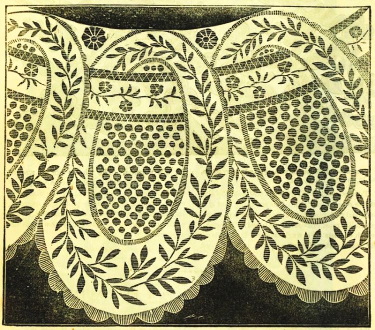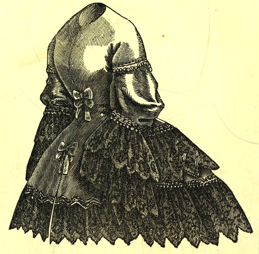 "In choosing mourning goods, the first essential, even before quality, is a good shade of black, neither blue nor rusty; a dead, solid color is considered most desirable. If possible, have the dress, mantle, and bonnet from the same piece, either in bombazine or silk. It gives the whole dress the same shade, and will wear alike. Never get a cheap material in black; it will be sure to fade or grow rusty. Here, especially, the dearest is always the cheapest in the end. For constant wear, we prefer cashmeres, or even plain mousselines, to bombazines. Black English chintzes make nice morning-dresses, and fade very little in washing. For summer wear, barèges, silk tissues, and grenadines are considered deep mourning. The cross-barred barège is the strongest, and grenadines of good quality will wear several years.