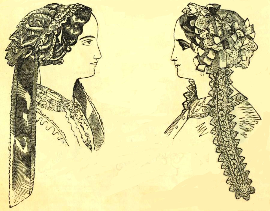 "Although not exactly belonging to our present purpose, we would mention that drawn hats of crape and grenadine, or even black straws trimmed with crape, are appropriate to the second style of dress we have mentioned, when the heat of the weather is too great for bombazine and silk.