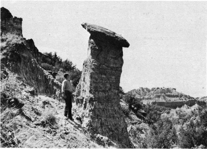 The rim of Palo Duro Canyon is formed by the Eastern Caprock Escarpment. Caprock is the term used to describe a massive layer of calcareous rock which supports the High Plains surface (see p. 26). Because it is more resistant to forces of erosion than the softer, underlying more or less horizontal strata, the caprock forms an abrupt, precipitous escarpment at the edge of the High Plains. With the exception of the resistant caprock, however, the surficial deposits on the High Plains are for the most part unconsolidated sediments.