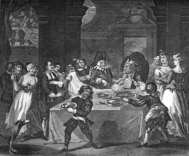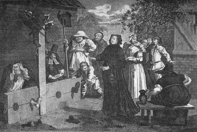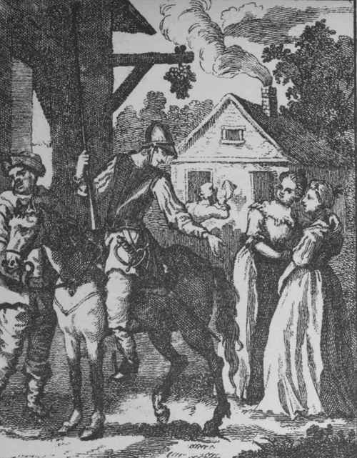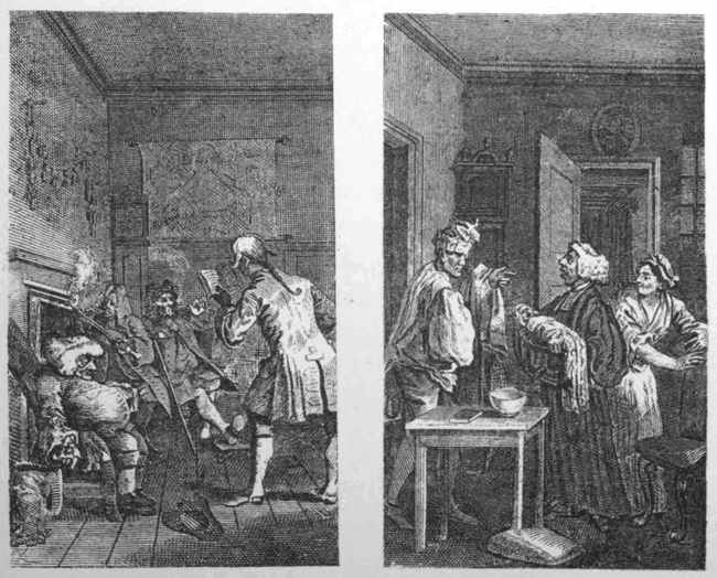 [98] Religious Ceremonies of all Nations, published at Amsterdam in 1735. He entitles this print, "Le Serment de la Fille qui se trouve enceinte." On the same page he has introduced a copy from Sympson's print of orator Henley christening a child, and calls it "Le Baptême Domestique."