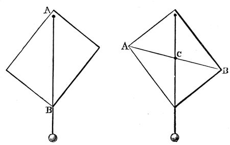 There is another point I want in the next place to draw your attention to. I have here a quantity of shot; each of these falls separately, and each has its own gravitating power, as you perceive when I let them fall loosely on a sheet of paper. If I put them into a bottle, I collect them together as one mass; and philosophers have discovered that there is a certain point in the middle of the whole collection of shots that may be considered as the one point in which all their gravitating power is centred, and that point they call the centre of gravity: it is not at all a bad name, and rather a short one—the centre of gravity. Now suppose I take a sheet of pasteboard, or any other thing easily dealt32 with, and run a bradawl through it at one corner A (fig. 3), and Mr. Anderson hold that up in his hand before us, and I then take a piece of thread and an ivory ball, and hang that upon the awl—then the centre of gravity of both the pasteboard and the ball and string are as near as they can get to the centre of the earth; that is to say, the whole of the attracting power of the earth is, as it were, centred in a single point of the cardboard—and this point is exactly below the point of suspension. All I have to do, therefore, is to draw a line, A B, corresponding with the string, and we shall find that the centre of gravity is33 somewhere in that line. But where? To find that out, all we have to do is to take another place for the awl (fig. 4), hang the plumb-line, and make the same experiment, and there [at the point C] is the centre of gravity—there where the two lines which I have traced cross each other; and if I take that pasteboard, and make a hole with the bradawl through it at that point, you will see that it will be supported in any position in which it may be placed. Now, knowing that, what do I do when I try to stand upon one leg? Do you not see that I push myself over to the left side, and quietly take up the right leg, and thus bring some central point in my body over this left leg. What is that point which I throw over? You will know at once that it is the centre of gravity—that point in me where the whole gravitating force of my body is centred, and which I thus bring in a line over my foot.