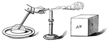 I have spoken of water, and first of all of its property of falling downwards. You know very well how the oceans surround the globe—how they fall round the surface, giving roundness to it, clothing it like a garment; but, besides that, there are other properties of water. Here,23 for instance, is some quick-lime, and if I add some water to it, you will find another power or property in the water.4 It is now very hot, it is steaming up, and I could perhaps light phosphorus or a lucifer match with it. Now, that could not happen without a force in the water to produce the result; but that force is entirely distinct from its power of falling to the earth. Again, here is another substance [some anhydrous sulphate of copper5] which will illustrate another kind of power. [The Lecturer here poured some water over the white sulphate of copper, which immediately became blue, evolving considerable heat at the same time.] Here is the same water, with a substance which heats nearly as much as the lime does; but see how differently. So great indeed is this heat in the case of lime, that it is sufficient sometimes (as you see here) to set wood on fire; and this explains what we have sometimes heard, of barges laden with quick-lime taking fire in the middle of the river, in consequence of this power of heat brought into play by a leakage of the water into the barge. You see how strangely different subjects for our con24sideration arise, when we come to think over these various matters,—the power of heat evolved by acting upon lime with water, and the power which water has of turning this salt of copper from white to blue.