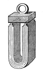 I now shall try to help your attention to what20 I may say by directing, to-day, our thoughts to one kind of power. You see what I mean by the term matter—any of these things that I can lay hold of with the hand, or in a bag (for I may take hold of the air by enclosing it in a bag)—they are all portions of matter with which we have to deal at present, generally or particularly, as I may require to illustrate my subject. Here is the sort of matter which we call water,—it is there ice [pointing to a block of ice upon the table], there water [pointing to the water boiling in a flask], here vapour—you see it issuing out from the top [of the flask]. Do not suppose that that ice and that water are two entirely different things, or that the steam rising in bubbles and ascending in vapour there is absolutely different from the fluid water. It may be different in some particulars, having reference to the amounts of power which it contains; but it is the same, nevertheless, as the great ocean of water around our globe, and I employ it here for the sake of illustration, because if we look into it we shall find that it supplies us with examples of all the powers to which I shall have to refer. For in21stance, here is water—it is heavy; but let us examine it with regard to the amount of its heaviness, or its gravity. I have before me a little glass vessel and scales [nearly equipoised scales, one of which contained a half-pint glass vessel], and the glass vessel is at present the lighter of the two; but if I now take some water and pour it in, you see that that side of the scales immediately goes down; that shews you (using common language, which I will not suppose for the present you have hitherto applied very strictly) that it is heavy: and if I put this additional weight into the opposite scale, I should not wonder if this vessel would hold water enough to weigh it down. [The Lecturer poured more water into the jar, which again went down.] Why do I hold the bottle above the vessel to pour the water into it? You will say, because experience has taught me that it is necessary. I do it for a better reason—because it is a law of nature that the water should fall towards the earth, and therefore the very means which I use to cause the water to enter the vessel are those which will carry the whole body of water down. That power is what we call22 gravity, and you see there [pointing to the scales] a good deal of water gravitating towards the earth. Now here [exhibiting a small piece of platinum2] is another thing which gravitates towards the earth as much as the whole of that water. See what a little there is of it—that little thing is heavier than so much water [placing the metal in opposite scales to the water]. What a wonderful thing it is to see that it requires so much water as that [a half-pint vessel full] to fall towards the earth, compared with the little mass of substance I have here! And again, if I take this metal [a bar of aluminium3 about eight times the bulk of the platinum], we find the water will balance that as well as it did the platinum; so that we get, even in the very outset, an example of what we want to understand by the words forces or powers.