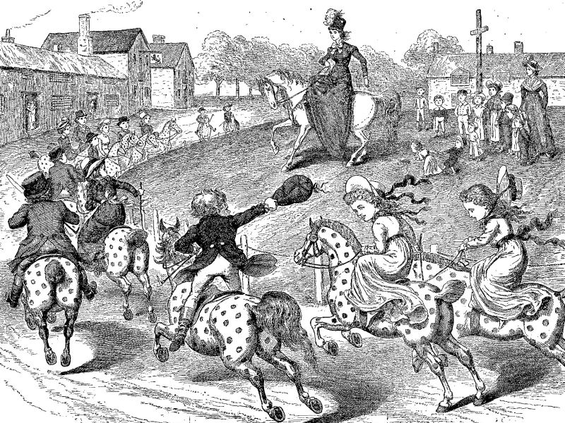 Marjorie was still watching with eager eyes, when again the doors opened and a second procession entered. This was as queer as the other was gorgeous, for all sorts of toys came in of themselves; not only rocking-horses, but baby houses and blocks (each one by itself), and toy alphabets, and tea sets walking, Noah's arks ahead of the animals, woolly dogs, and bears on sticks. Directly after them came Marjorie's horse, and Nine-times-naught, with Augusta on the Kennebec.