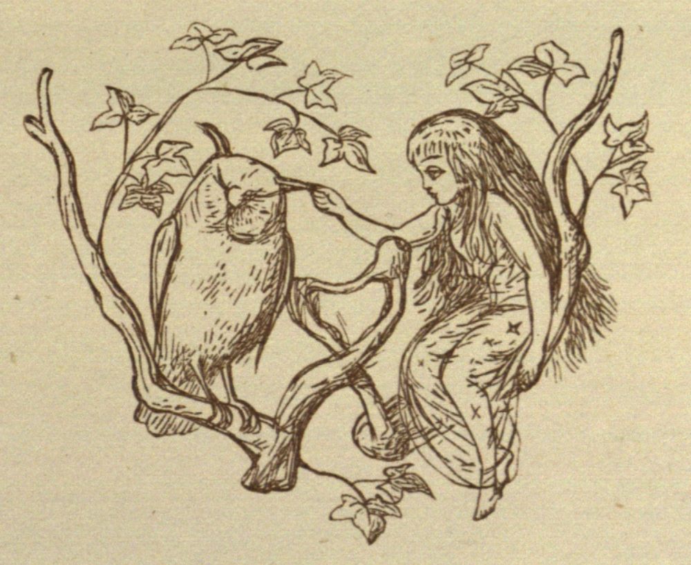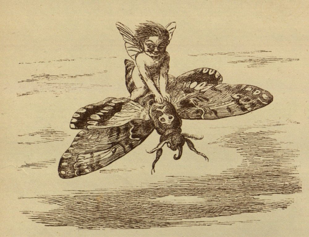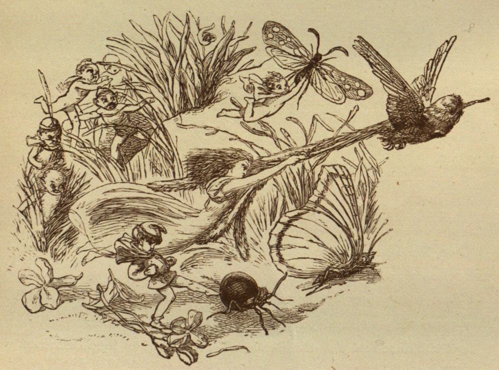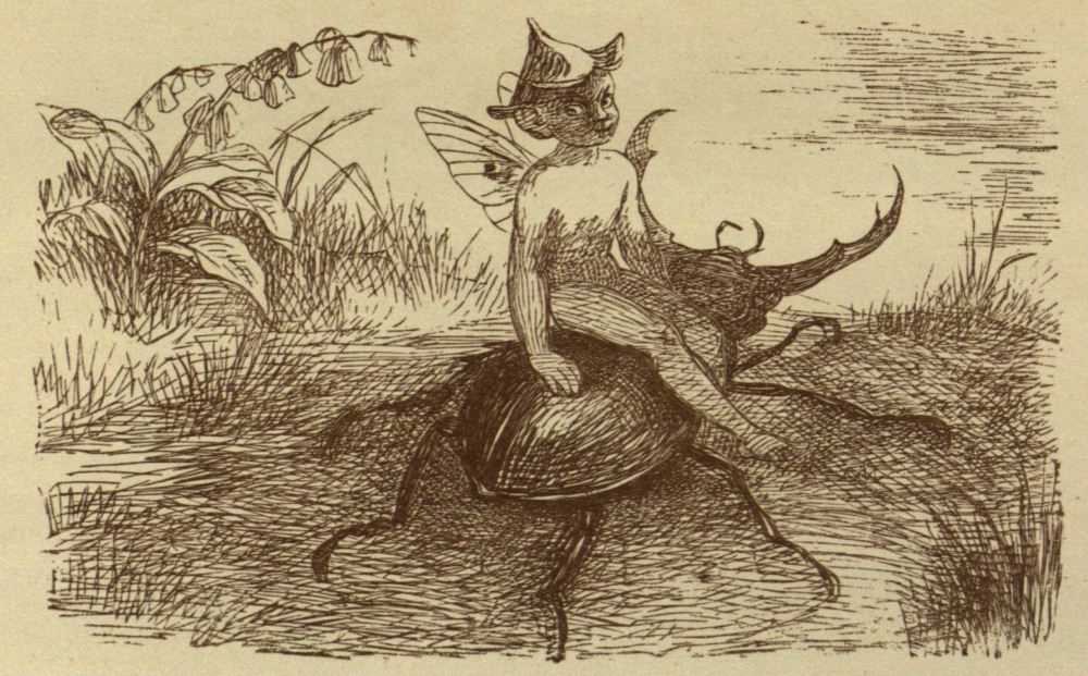 It is impossible to say what would have happened; and probably the Prince would have died of sorrow and hunger (for he ate nothing), if the Black Beetle had not one day met a Bat, which was the favourite charger of Puck. Now Puck, as all the world knows, is the Jester at the Court of Fairy Land. He can make Oberon and Titania—the{47} King and Queen—laugh at the tricks he plays, and therefore they love him so much that there is nothing they would not do for him. So the Black Beetle began to talk about his master, the Prince, to the Bat Puck commonly rode; and the Bat, a good-natured creature, told the whole story to Puck. Now Puck was also in a good humour, so he jumped at once on his Bat’s back, and rode off to consult the King and Queen of Fairy Land. Well, they were sorry for the Prince—he had only broken one little Fairy law after all—and they sent Puck back to tell him what he was to do. This was to find the Blue Bird again, and get the Blue Bird to guide him to the home of the Water Fairy, the Godmother of the Princess.