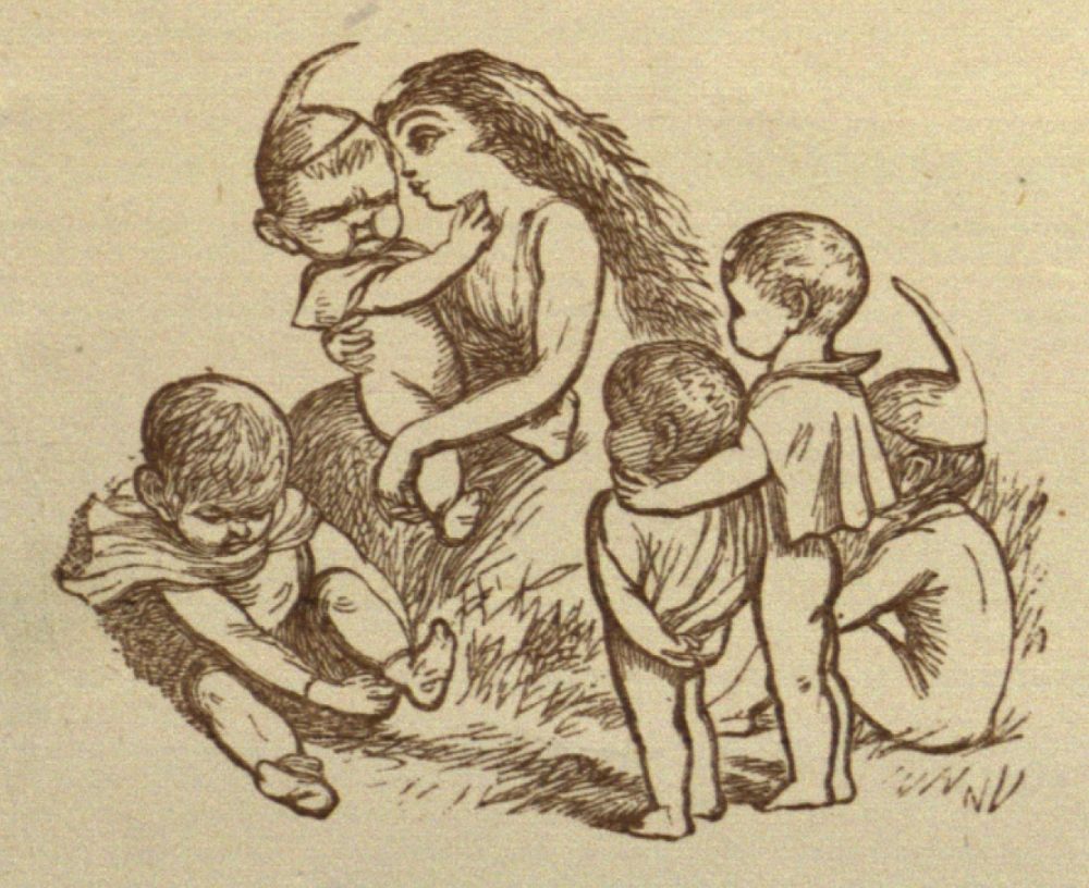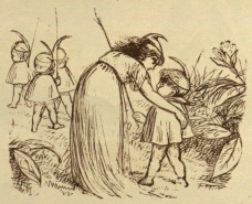 The Prince thought the Elves could help him perhaps, so he went and asked them how to waken his friends. They were all awake, and the Fairies were dressing the baby-Elves. But they only said, “Oh! its their fault for sleeping under a Mushroom. Anybody would know that is a stupid thing to do. Besides, we have no time to attend to them, as the sun will be up soon, and we must get these Babies dressed and be off before then.”