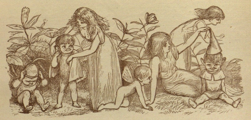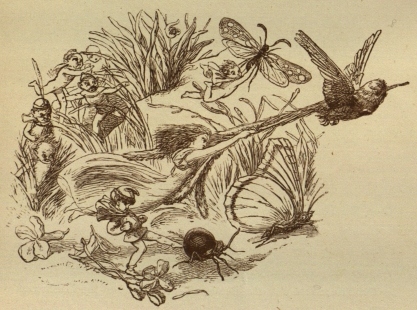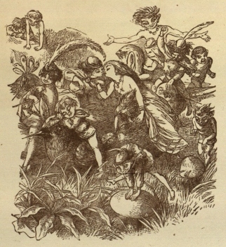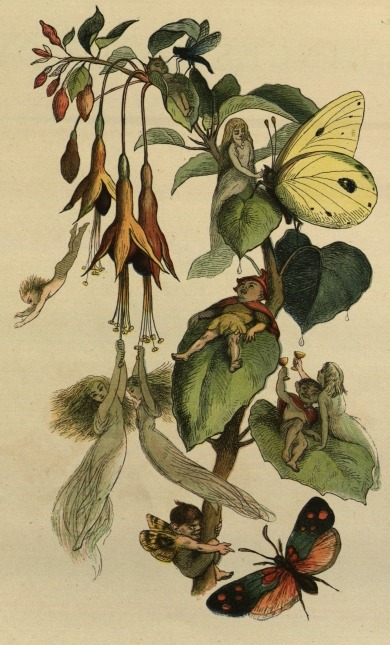 all you babes at Branxholm Park,ONCE upon a time, when Fairies were much more common than they are now, there lived a King and a Queen. Their country was close to Fairy Land, and very often the little Elves would cross over the border, and come into the King’s fields and gardens. The girl-fairies would swing out of the bells of the fuschias, and loll on the leaves, and drink the little drops of dew that fell down the stems. Here you may see all the Fairies making themselves merry at a picnic on a fuschia, and an ugly little Dwarf is climbing up the stalk.{10}