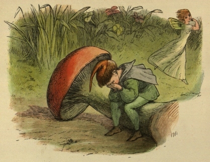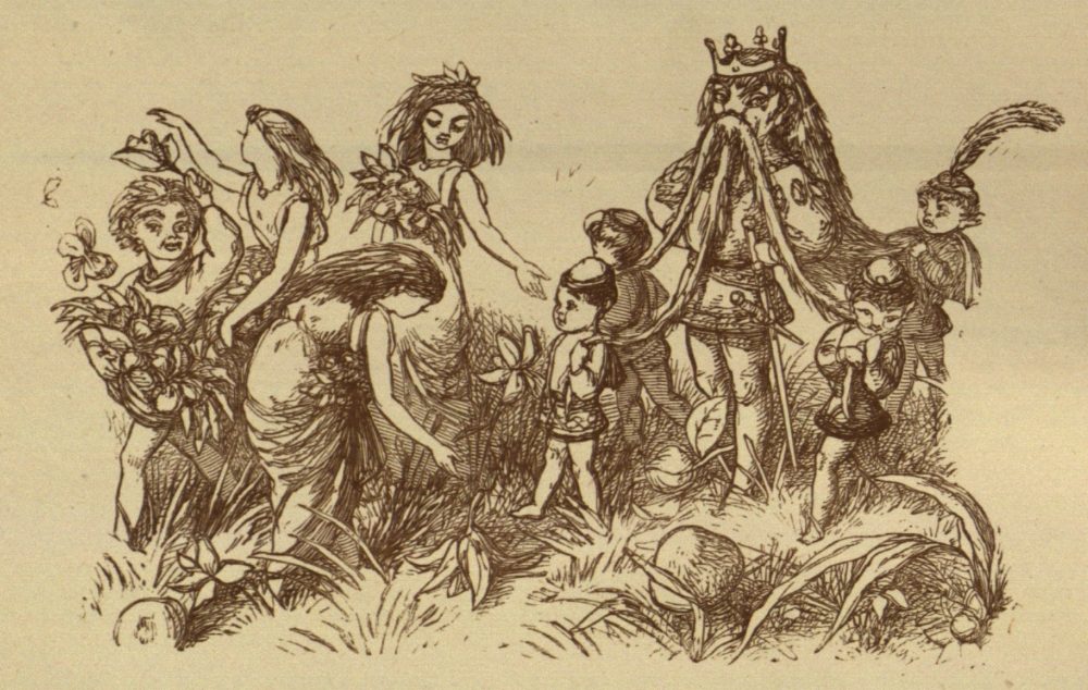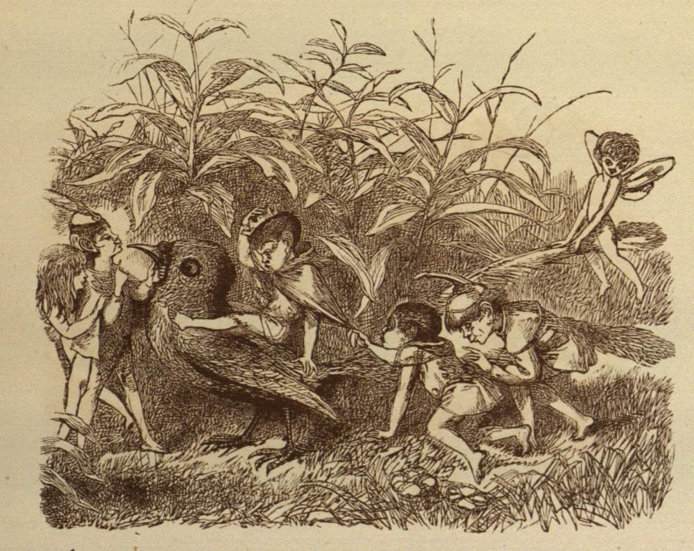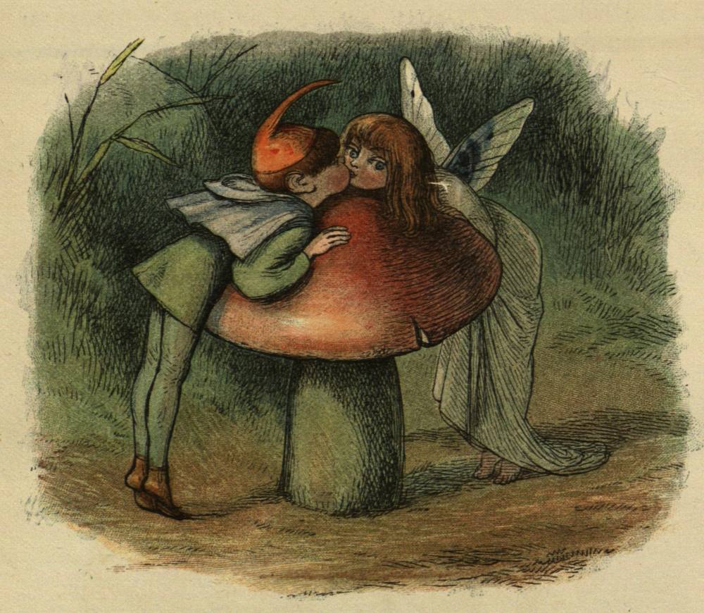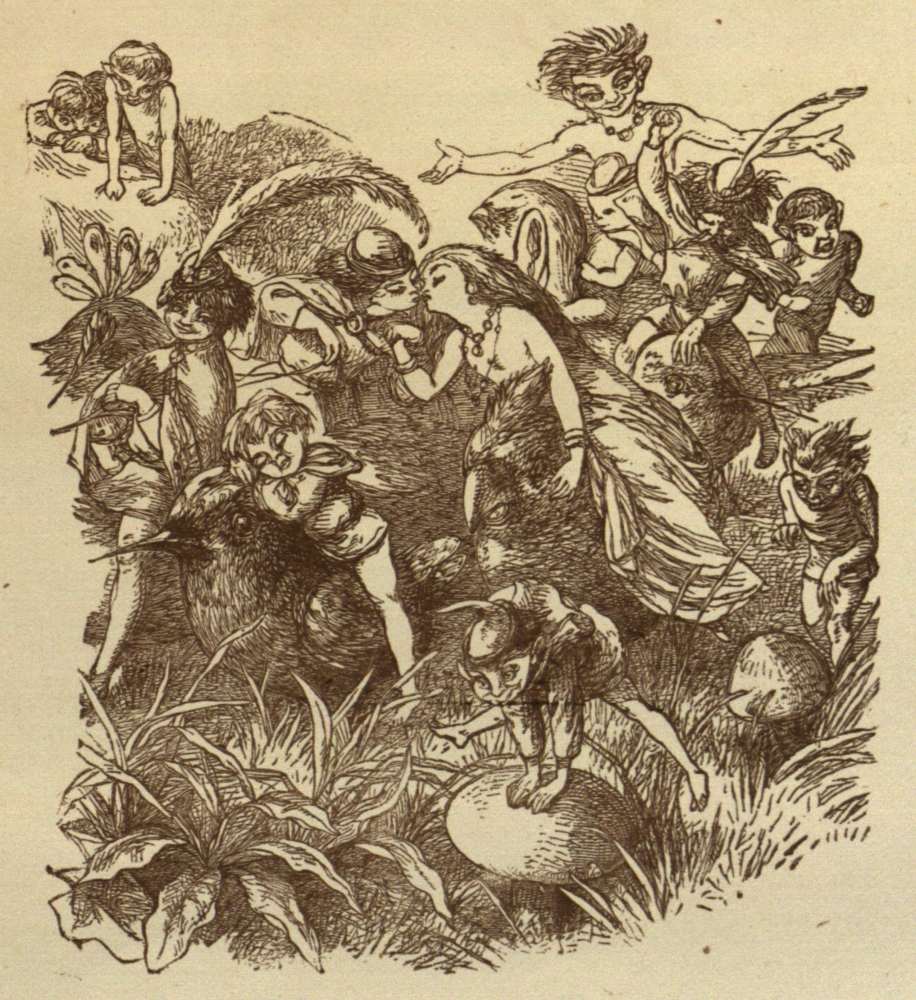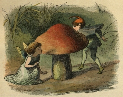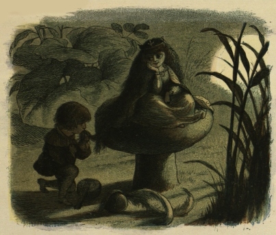 So off they set for the Blue Bird’s nest; and, to make a long story short, the Prince stole two of the eggs, and would not give them back, till the Bird promised to tell him all it knew. And the end of it was, that the Bird carried him to the Court of the Queen of Mushroom Land. She was sitting, in her Crown, on a Mushroom, and she looked very funny and mischievous.
