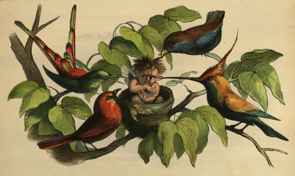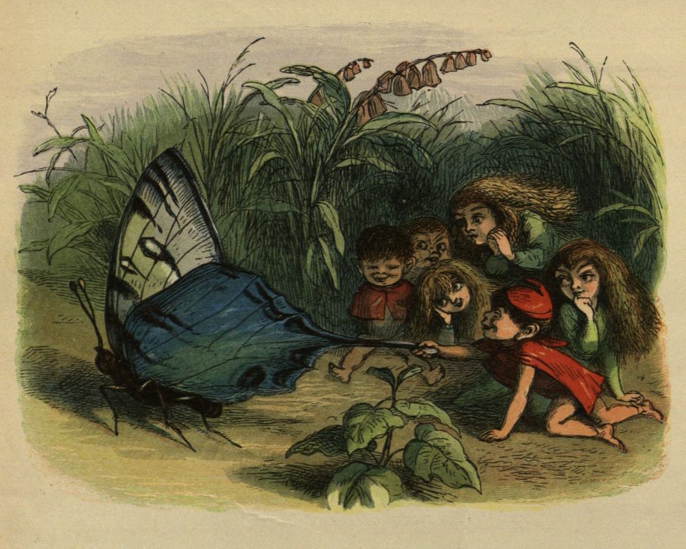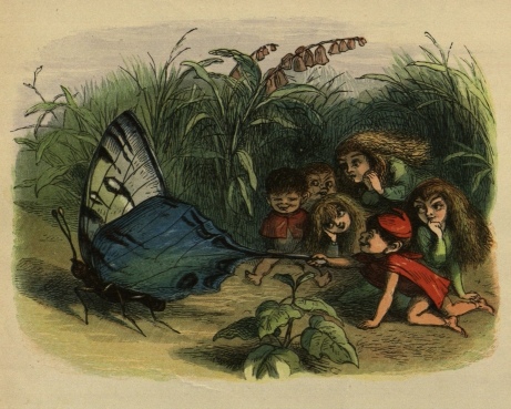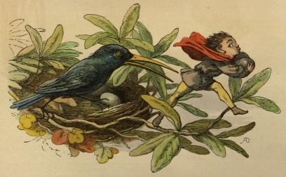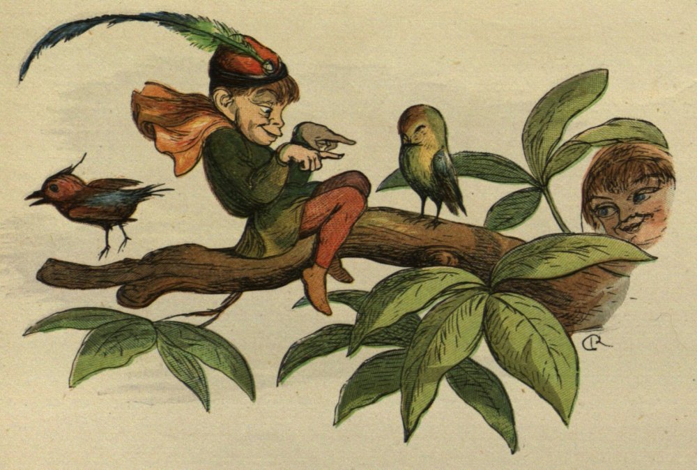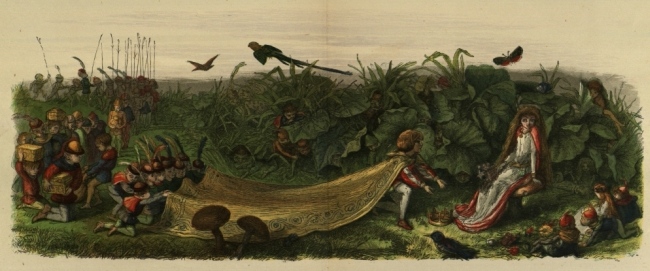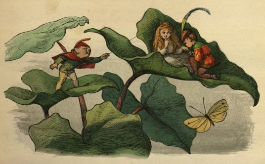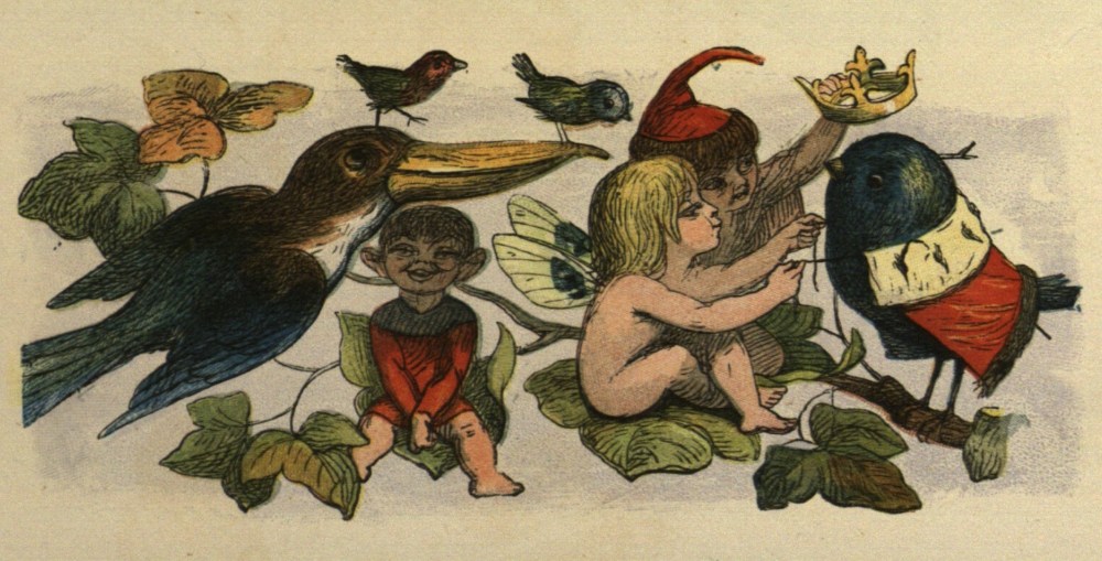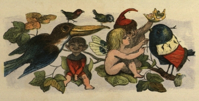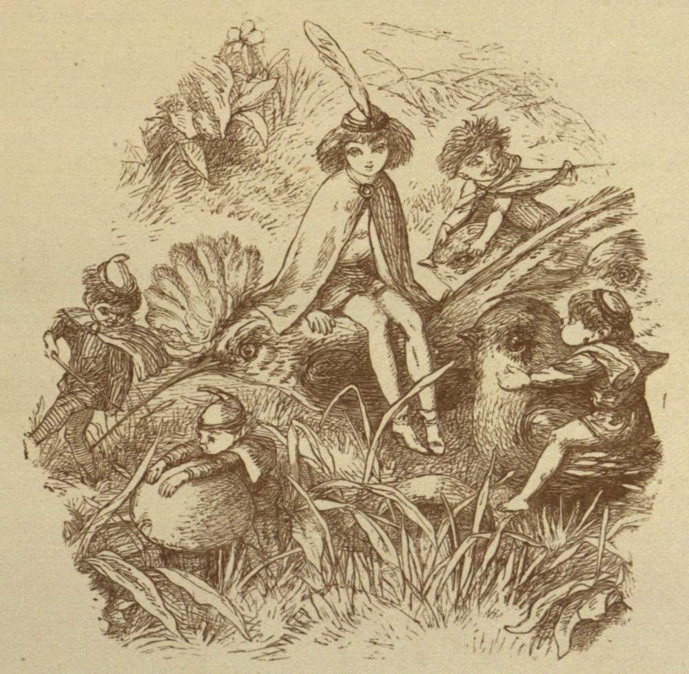 So off they set for the Blue Bird’s nest; and, to make a long story short, the Prince stole two of the eggs, and would not give them back, till the Bird promised to tell him all it knew. And the end of it was, that the Bird carried him to the Court of the Queen of Mushroom Land. She was sitting, in her Crown, on a Mushroom, and she looked very funny and mischievous.