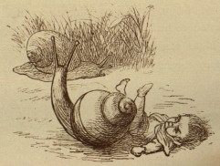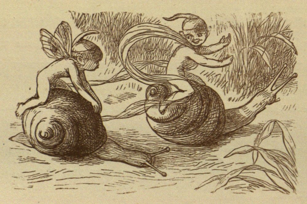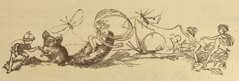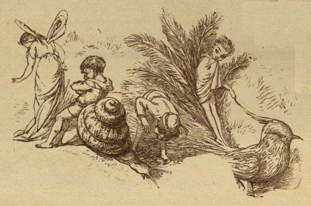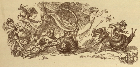 Well, the tournaments were over, and off all the Princes went into Fairy Land. What funny sights they saw in Fairy Land! They saw a great Snail race, the Snails running so fast, that some of the Fairy jockeys fell off on the grass. They saw a Fairy boy dancing with a Squirrel, and they found all the birds, and all the beasts, quite friendly and kind, and able to talk like other people. This was the way in old times, but now no beasts talk, and no birds, except Parrots only.