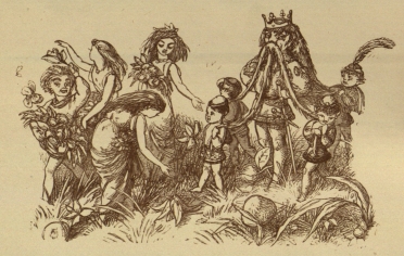 “Journeys end in lovers meeting,” and so do Stories. The Prince has his Princess once again, and I can tell you they did not wait long, this time, in the Valley Magical. Off they went, straight home, and the Black Beetle guided them, flying in a bee-line. Just on the further border of Mushroom Land, they came to all the Princes fast asleep. But when the Princess drew near, they all wakened, and jumped up,{53} and they slapped the fortunate Prince on the back, and wished him luck, and cried, “Hullo, Comical, old chap; we hardly knew you! Why, you’ve grown quite handsome!” And so he had; he was changed into Prince Charming again, but he was so happy he never noticed it, for he was not conceited. But the Princess noticed it, and she loved him all the better. Then they all made a procession, with the Black Beetle marching at the head; indeed, they called him “Black Rod” now, and he was quite a Courtier.
