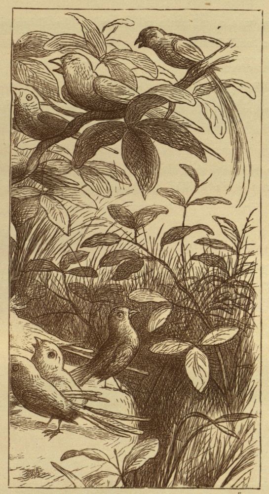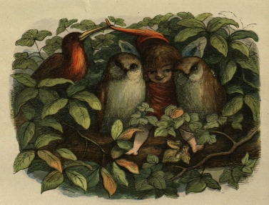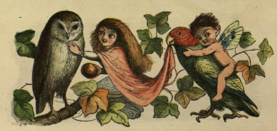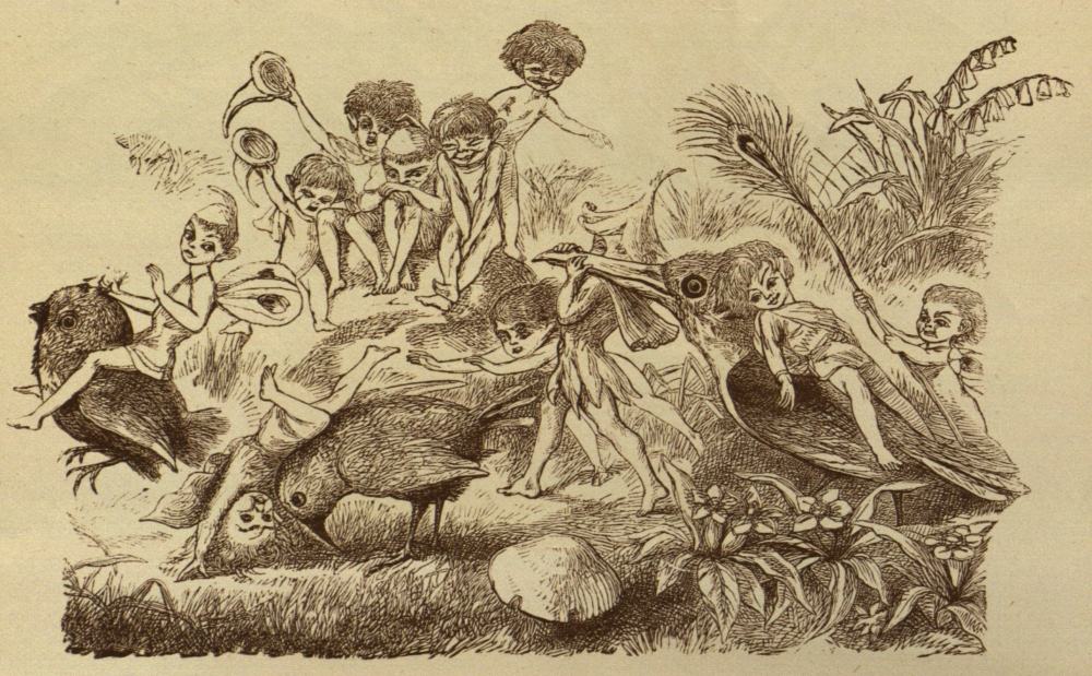 people (who said they “could not see why the first Royal baby should be called ‘Ninety’ ”) always spoke of her as the Princess Nobody. Only the Courtiers called her Niente. The Water Fairy was her Godmother, but (for a Fairy reason) they concealed her real name, and of course, she was not christened Niente. Here you may see her sitting teaching the little Birds to sing. They are all round her in a circle, each of them singing his very best. Great fun she and all her little companions had with the Birds; here they are, riding on them,{16} and tumbling off when the Bird kicks. And here, again, you may observe the baby Princess riding a Parrot, while one of her Maids of Honour teases an Owl. Never was there such a happy country; all Birds and Babies, playing together, singing, and as merry as the day was long.