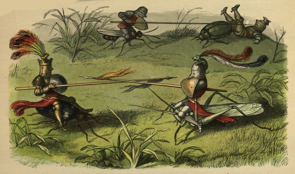 “Never mind; we can only try,” said the Queen. So she sent out messengers into all the world, and sent the picture of the Princess everywhere, and proclaimed that the beautiful Princess Niente, and no less than three-quarters of the Kingdom would be given to the Prince{23} that could find the Princess and bring her home. And there was to be a great tournament, or sham fight, at the Palace, to amuse all the Princes before they went on the search. So many Princes gathered together, all full of hope; and they rode against each other with spears and swords, and knocked each other about, and afterwards dined, and danced, and made merry. Some Fairy Knights, too, came over the border, and they fought with spears, riding Beetles and Grasshoppers, instead of horses. Here is a picture of a “joust,” or tournament, between two sets of Fairy Knights. By all these warlike exercises, they increased their courage till they felt brave enough to fight all the Ghosts, and all the Giants, if only they could save the beautiful Princess.