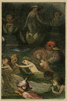 Long and far the Prince wandered, but at last he found the Blue Bird once more. And the Bird (very good-naturedly) promised to fly in front of him till he led him to the beautiful stream, where the Water Fairy held her court. So they reached it at last, and then the Blue Bird harnessed himself to the chariot of the Water Fairy, and the chariot was the white cup of a Water Lily. Then he pulled, and pulled at the chariot (here he is dragging along the Water Fairy), till{49} he brought her where the Prince was waiting. At first, when she saw him, she was rather angry. “Why did you find out my God-daughter’s name?” she said; and the Prince had no excuse to make. He only turned red, and sighed. This rather pleased the Water Fairy.