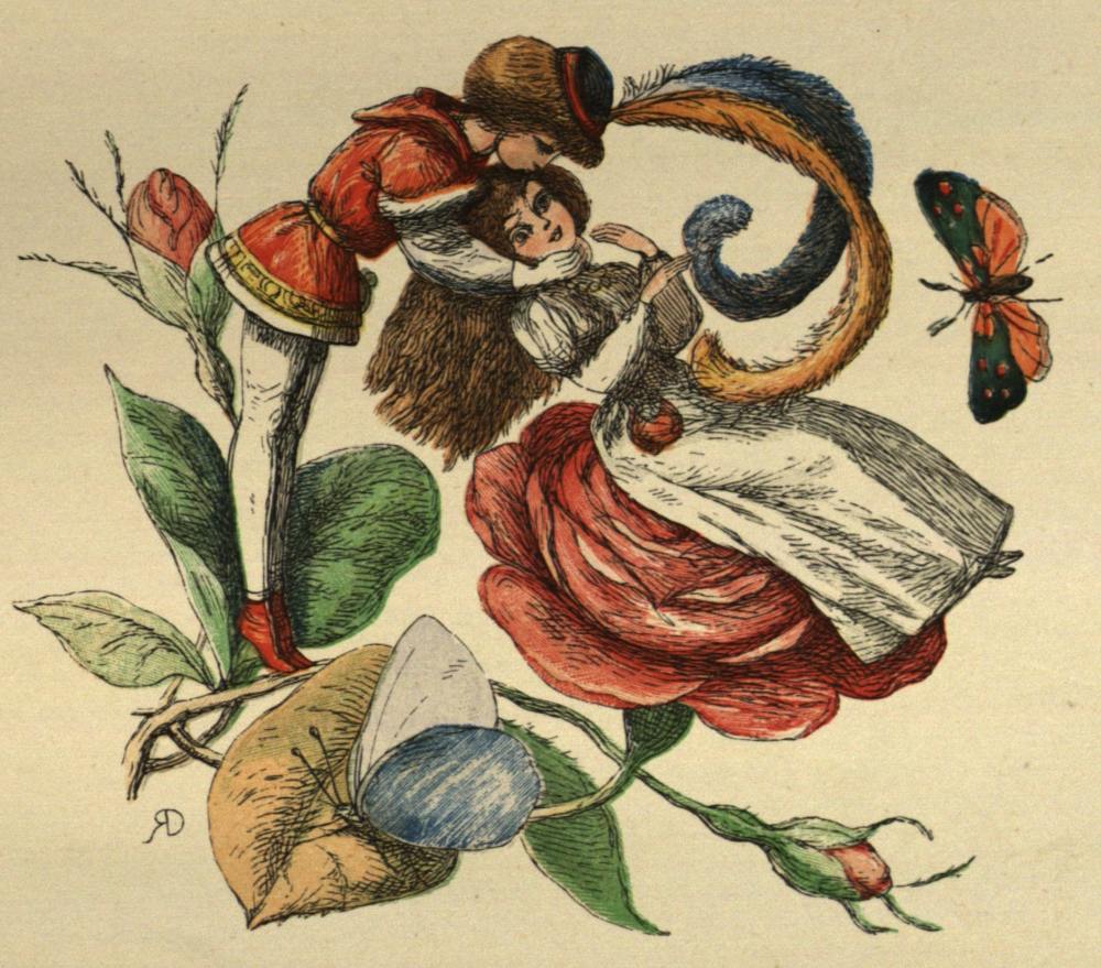 them, and laughed, and cried for joy, and kissed them again. You may be sure the old Nurse was out among the foremost, her face quite shining with pleasure, and using longer words than the noblest there. And she admired the Prince very much, and was delighted that “her girl,” as she called the Princess, had got such a good husband. So here we leave them, and that country remained always happy, and so it has neither history nor geography. Therefore you won’t find it on any map, nor can you read about it in any book but this book.{55} Lastly, here is a picture of the Prince and Princess at home, sitting on a beautiful Rose, as a Fairy’s God-child can do if she pleases.