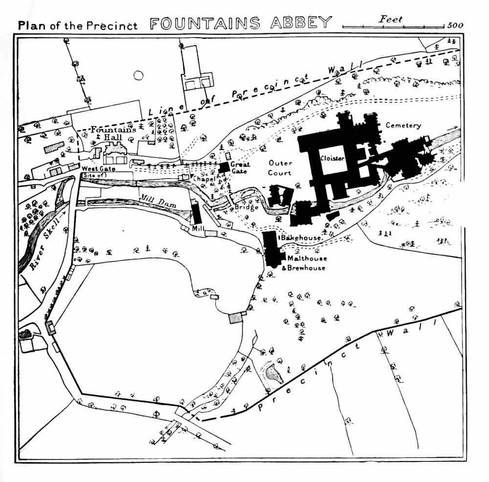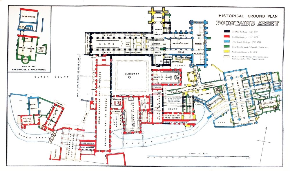 The ruins have been minutely examined by Mr. St. John Hope, who has left no stone unconsidered. He has brought to his study of the Abbey a profound knowledge of monastic architecture. The account of his investigations is published in the fifteenth volume of the “Yorkshire Archæological Journal,” to which is appended a historical ground-plan of the Abbey, drawn by Mr. Harold Brakspear. The Marquess of Ripon has had copies of this plan framed and placed in various parts of the buildings for the information of visitors. Through the courtesy of Mr. Hope and Mr. Brakspear I am enabled to give a reduced version of this excellent plan.