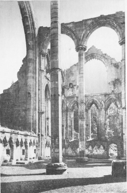 Entering beneath the Norman arch of the west door, the visitor found over his head a gallery which carried the great organ. A screen supported the gallery, making a vestibule for the church, keeping out the wind. A fragment of the base of this screen remains on the south side, near a bit of the pavement which was put in by John of Kent. Standing in the screen door and looking to the east, the high roof reached over the nave, the choir, the presbytery, and the chapel of the nine altars, to the splendour of the east window. The Norman nave and transepts, with their great pillars and round-headed clerestory windows, repre{60}sent the primitive Puritan simplicity of the Cistercians. The choir and presbytery and the nine-altars chapel are in the style called Early English. The great windows, east and west, replacing plainer windows, are, like the tower, in the style called Perpendicular. To-day, by the destruction of the choir and presbytery, the whole church in its great length lies open to the view, but in the middle ages it was crossed by three stone screens.